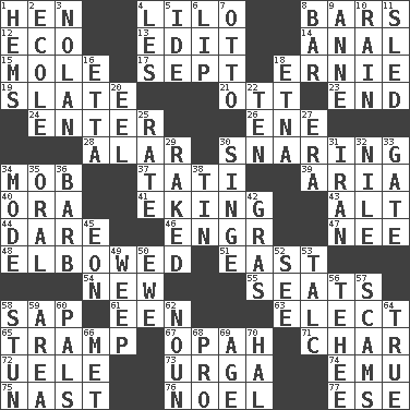 ACROSS 1. Layer 4. _ and Stitch 8. Long, evenly shaped pieces 12. Environmental prefix 13. Prepare for publication 14. Of or related to the anus 15. Undercover agent 17. Back-to-school mo. 18. Bert's buddy 19. Chalkboard 21. Baseball player Mel 23. Conclude 24. Keyboard key 26. Compass dir. 28. Having or resembling wings 30. Catching in a trap 34. Crowd into 37. Jacques of French films 39. Operatic vocal solo 40. Mouth or opening 41. Supplementing with great effort 43. Keyboard modifier key 44. Have the gumption 46. Engineer (abbr.) 47. Born 48. Shoved, as through a crowd 51. Compass direction 54. ___ Haven, CT 55. Theater features 58. Plant excrement 61. Car or cant ending 63. Opt 65. _____ steamer (cargo ship) 67. Brightly colored fish 71. Burn to charcoal 72. Ubangi River tributary 73. Capital and largest city of Mongolia 74. Australian flightless bird 75. Political cartoonist Thomas 76. Christmas carol 77. Compass dir. DOWN 1. Folds over and sews together 2. Learning spot: Fr. 3. Pitcher Ryan 4. French article 5. Binary compound 6. Mouth edge 7. Von Bismarck 8. Tavern 9. Singer Murray 10. Precipitation 11. Downhill vehicle 16. Singer James 18. Inactive volcano in Sicily 20. Snakelike fish 22. "___ Little Indians" 25. Assign a rank or rating to 27. Epoch 29. Swept the length of 30. Burn superficially 31. SW Asia republic 32. The longest river in the world 33. Yard entry 34. Method 35. Of the mouth 36. Sharp remark 38. Shallow baking pan 42. Pate de foie ____ 45. Age 49. Shed a tear 50. She-sheep 52. Perceive with the eye 53. Baby powder 56. Giggle 57. Fraudulent business schemes 58. Surprise greatly 59. Type of rug 60. Friends 62. Part of speech 64. Loyal 66. Was introduced to 68. Adept person 69. Mature 70. Actor Linden