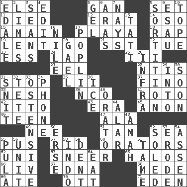 ACROSS 1. Otherwise 5. Separate the seeds from cotton 8. Put into a specified state 11. Passed on 12. Part of Q.E.F. 14. Bear (Spanish) 15. With great haste 17. Beach, in Buenos Aires 18. Strike 19. Small, flat, pigmented spot on the skin 21. Fast jet (abbr.) 22. Third day of the wk. 23. Double-curved letter 24. Infant locale 25. One more than two 27. Snakelike fish 28. Nuclear Threat Initiatives 31. Halt 35. Cards in a Roman deck? 37. Fine (Spanish) 38. Tender 39. Non-commissioned officer (abbr.) 41. Printing process, for short 42. "Tell ____ the Marines!" 43. Period 45. Soon (poet.) 46. Adolescent 47. Wing 49. Born 51. Scottish cap 52. Ocean 55. Ichor 57. To free from 60. Speakers 62. Single; one (prefix) 63. Contemptuous expression 65. Auras 66. 54 in ancient Rome 67. Pulitzer Prize-winning author Ferber 68. Ancient Persian 69. Had dinner 70. Baseball player Mel 71. Genesis locale DOWN 1. Peak District village in England 2. Citrus fruits 3. Actors Connery and Penn 4. Prepare for publication 5. Set 6. Ancient river in northeast Turkey 7. Negative votes 8. Drawing lots 9. Son of Isaac 10. Drink excessively 13. Jacques of French films 16. Mediterranean tributary 17. Cotton for raincoats, e.g. 20. Highlander 26. Kind of red light 29. To the inside or interior of 30. Within a short period 31. In a ____ (agitated or irritated) 32. Wig 33. Clearly or manifestly demonstrative 34. Give a jingle 36. Frozen water 40. Speaker 44. Having or resembling wings 48. Wet nurse 50. Celtic language 52. Having a sole or soles 53. Wear away 54. NE Netherlands city 55. Monetary unit of Botswana 56. A single undivided whole 58. Southeast Asian peninsula 59. Scratch 61. Not wild 64. Ingest