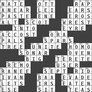 ACROSS 1. Nathan's nickname 5. Baseball player Mel 8. Strike 11. Approach 13. Flowery wreath 14. Hearing organs 15. Thick mixture 16. Compass dir. 17. Greek god of love 18. The first octave above the treble staff 19. Native of Scotland 21. Obtain by seizing forcibly or violently 22. To the inside or interior of 24. Jane of fiction 25. Buttonhole 27. Mouth or opening 29. Friends 30. Practice fights 32. Family _ (genealogy) 33. Join together 35. Same (prefix) 39. Echolocation 41. Baking chamber 42. Large 43. Cylindrical with tapered ends 45. San ____ (Riviera town) 48. One who uses or employs something 49. The wife of a rajah (variant) 50. Back-to-school mo. 52. To free from 55. _ the terrible 56. Sound made by sheep 57. Dodge 59. Allows 60. Big collection agency 61. Ingested 62. Compass dir. 63. Be seated 64. Afternoon social gatherings DOWN 1. California wine valley 2. Of or related to the anus 3. A testis 4. Consume 5. Butter sub 6. Portable shelter 7. Neckwear 8. More valued for its uncommonness 9. Came up 10. Inconspicuous attention getter 12. Musical pauses 14. Suggestive of the supernatural 20. Small bed 21. Put on (as clothing) 23. Olfactory organs 25. Fitting 26. Automobile 27. Choose 28. Actress Charlotte 30. Title for a knight 31. Dinah or Pauly 33. Corn or form start 34. Tired old horse 36. Make much ado about nothing 37. Was introduced to 38. Single 40. Mitch Miller's instrument 43. Uncastrated adult male sheep 44. First name in cosmetics 45. All-night dance parties 46. Maternal 47. Not women's 49. Cause heat under the collar 50. Indian skirt 51. Compass direction 53. The main thing one is thinking about 54. Cub Scout units 56. Again 58. Large container