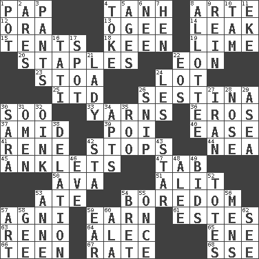 ACROSS 1. Infant food 4. Hyperbolic tangent 8. Johnson of "Laugh-In" 12. Mouth or opening 13. Double curve, resembling the letter S 14. Path through which fluid escapes 15. Portable shelters 18. Peachy ____! 19. Welles in "The Third Man" 20. Paper fasteners 22. Age 23. Portico 24. Car dealer's back yard 25. It would 26. French poetic form 30. "Barney Miller" actor Jack 33. Entertaining tales 36. Greek god of love 37. Among 39. Luau course 40. Comfort 41. French philosopher Descartes 42. Ceases 44. Teachers' org. 45. Short socks 47. Bar bill 50. Actress Gardner 51. Set down 53. Had dinner 54. Mood resulting from idleness 57. Hindu god of fire 59. Merit 61. _____ Park, CO 63. Former U.S. Attorney General Janet 64. Actor Baldwin 65. Compass dir. 66. Adolescent 67. Assign a rank or rating to 68. Compass dir. DOWN 1. Plant holder 2. Ancient Greek god of war 3. Leg coverings 4. Casino tip 5. Eras 6. Born 7. Layer 8. One to whom something is allotted 9. It's straight from the horse's mouth 10. Scottish cap 11. Make supply last 16. Jacques of French films 17. Specific locale 21. Kenny Rogers chart-topper in '80 22. Greek goddess of the dawn 24. French article 26. Clip 27. SW Asia republic 28. Olfactory organ 29. Toward the sea 30. "Two Mules for Sister ____" 31. Sign of things to come 32. Pig sound 34. Flats, for short 35. Friend of Pooh 38. Conveyance 42. R.R. building 43. Play the lead 46. Night before a holiday 48. Toward shelter 49. Auction offers 52. Hauls 53. Queen of England 1702-14 54. Cy Young winner Saberhagen 55. At one time in the past 56. Not women's 57. Tate display 58. Turn to the right 59. Hearing organ 60. In the manner of 62. Perceive with the eye