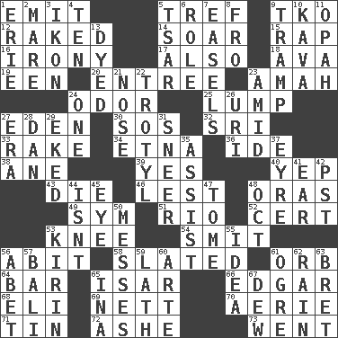 ACROSS 1. Give off 5. Not kosher 9. Ring climax 12. Moved through 14. Fly high 15. Hit sharply and swiftly 16. Literary sarcasm 17. In addition 18. Actress Gardner 19. Car or cant ending 20. Main course 23. Housemaid 24. Aroma 25. Mass 27. Locale of original sin 30. Distress signal 32. _ Lanka 33. Libertine 34. Inactive volcano in Sicily 36. Binary compound 38. One (Scot) 39. Affirmative reply 40. Slangy assent 43. Pass on 46. For fear that 48. Mouths or openings 49. Symbol (abbr.) 51. River (Sp.) 52. Sure thing 53. Leg joint 54. Stricken, poetically 56. "This won't hurt ____!" 58. Scheduled 61. Globe 64. Soap unit 65. Austrian river, tributary to the Danube 66. _ Allan Poe 68. Connecticut Ivy Leaguer 69. Remaining after all deductions 70. Nest on high 71. Shallow baking pan 72. American tennis player Robert 73. Gone DOWN 1. One of the Great Lakes 2. Female horse 3. Visual representation of an object 4. Nine, plus one 5. Russian ruler of old 6. Hero or heavy, e.g. 7. Artist's stands 8. Away 9. _____ steamer (cargo ship) 10. Polynesian shrub of the pepper family 11. Brightly colored fish 13. Colored 21. Olfactory organ 22. TNT 23. Among 24. Single 26. RI univ. 27. Period 28. One of the 12 tribes of Israel 29. Supplemented with great effort 31. Scornful expression 35. Aid 37. Jane of fiction 41. Hearing organ 42. Pacific Standard Time (abbr.) 44. Is not 45. Sight organ 47. Heavy book 48. Sep. follower 50. Makes clutter 53. Japanese brewing company 55. The content of cognition 56. Collude with 57. Indonesian resort city 59. Thin strip of wood or metal 60. Johnson of "Laugh-In" 61. Legendary monster 62. Water falling in drops from the sky 63. Cy Young winner Saberhagen 65. _ tizzy (2 wds.) 67. Morning condensation