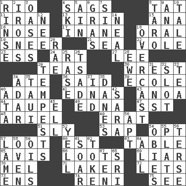 ACROSS 1. _ de Janeiro 4. Settles 8. Make lace 11. SW Asia republic 13. Japanese brewing company 15. Santa ___, CA 16. Characteristic smell of wine 17. Empty; void 18. Relating to the mouth 19. Contemptuous expression 21. Ocean 22. Short-tailed, large-bodied rat 23. Curvy letter 24. Tate display 27. Area sheltered from the wind 29. Beverages made from leaves 30. Obtain by seizing forcibly or violently 34. Had dinner 36. Stated 39. Learning spot: Fr. 40. First of billions? 41. Ferber et al. 43. Small Philippine buffalo 44. Grayish beige 46. Pulitzer Prize-winning author Ferber 47. Fast jet (abbr.) 48. Satellite of Uranus 49. Part of Q.E.F. 51. Stealthy 53. Plant excrement 54. Choose 57. Spoils 60. Eastern Standard Time (abbr.) 63. Eating place 65. Advice 66. Plunders 69. One who doesn't tell the truth 70. Cartoonist voice _ Blanc 71. Member of a famous L.A. basketball team 72. Allows 73. Followers of ems 74. Painter Guido (1575-1642) 75. Observe DOWN 1. Remove soap 2. Removes the wrinkles 3. Fertile tracts in a desert 4. What Jean-Claude Killy likes to do 5. The 18th letter of the Arabic alphabet 6. Pate de foie ____ 7. Trig term 8. Pacific island yam 9. Of or related to the anus 10. Falsehood 12. Born 14. Be tempered by heat 18. Cloudy 20. Actress Charlotte 25. To erase 26. Sadhe (variant) 28. She-sheep 29. Storms 31. Immeasurably long periods of time 32. Slit 33. Afternoon social gathering 34. The sixth month of the Jewish calendar 35. "Change" in Tahitian 37. Working for oneself (abbr.) 38. Natives or inhabitants of Denmark 40. _ moment's notice (2 wds.) 42. "Two Mules for Sister ____" 45. Pipe bend 50. Fitting 52. Shout 54. Off-Broadway awards 55. Food holder 56. Laconic 57. Unable to walk 58. Baking chamber 59. Lubricates 61. Fly high 62. Casino tip 64. Everything 67. "___ Little Indians" 68. Indian title of respect (Mr.)