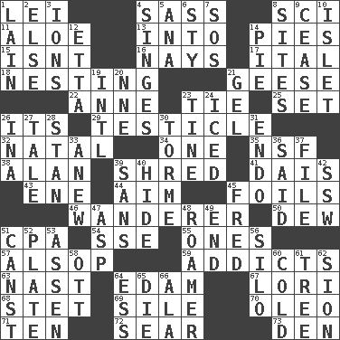 ACROSS 1. Flowery wreath 4. Backtalk 8. _-fi 11. Medicinal plant 13. To the inside or interior of 14. Sliced desserts 15. Is not 16. Negative votes 17. Slanted text style (abbr.) 18. Snuggling 21. Honkers 22. Queen of England 1702-14 23. Neckwear 25. Put into a specified state 26. ___ a Wonderful Life 29. One of the two male reproductive glands 32. Brizilian seaport 34. Single 35. Science/research agcy. 38. Actor Alda or Thicke 39. Fragment 41. Raised platform 43. Compass dir. 44. Direct toward a target or goal 45. Fencing necessities 46. Nomad 50. Morning condensation 51. Tax preparer (abbr.) 54. Compass dir. 55. Washington bills 57. Columnist Joseph or Stewart 59. Inveterate users 63. Political cartoonist Thomas 64. Dutch treat 67. Australian parrot (variant) 68. Proofreading order 69. Drop; flow; fall 70. Butter sub 71. Nine, plus one 72. Dry up 73. Lair DOWN 1. (Had) reclined 2. Otherwise 3. Charged atoms 4. Scorches 5. Santa ___, CA 6. Filthy place 7. Distress signal 8. Settings 9. Stop 10. Small island 12. Singer James 14. Sliced dessert 19. International (abbr.) 20. Compass dir. 21. Set 23. Prong on a fork 24. On the rocks 26. _ tizzy (2 wds.) 27. Falsehood 28. Comedian Laurel of Laurel & Hardy 30. Singer Mel 31. Inside; within (prefix) 33. Afresh 36. Expressed in words 37. Do some clerical work 39. Without 40. Flintstone garb 42. Compass dir. 45. Flintstone 47. Viper 48. Nomad 49. Conclude 51. 2nd pers. sing. pres. of can (arch.) 52. Food holder 53. NE Netherlands city 56. Grain storage tower 58. Baseball player Mel 60. Chilled 61. Family _ (genealogy) 62. The Jewish people; Israel 64. Curvy letter 65. Expire 66. In the manner of