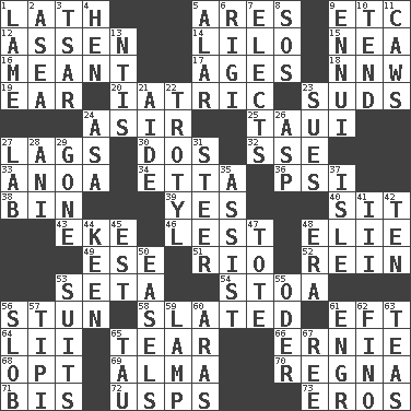ACROSS 1. Thin strip of wood or metal 5. Ancient Greek god of war 9. And so on (abbr.) 12. NE Netherlands city 14. _ and Stitch 15. Teachers' org. 16. Intended 17. Ripens 18. Compass dir. 19. Ewer handle 20. Of or pertaining to medicine 23. Soap bubbles 24. SW Saudi Arabia district 25. "Change" in Tahitian 27. Straggles 30. Two (Sp.) 32. Compass dir. 33. Small Philippine buffalo 34. Singer James 36. 23rd letter of the Greek alphabet 38. Storage container 39. It is so 40. Be seated 43. Supplement with great effort 46. For fear that 48. Writer Wiesel 49. Compass dir. 51. _ de Janeiro 52. It's straight from the horse's mouth 53. Stalk of a moss capsule 54. Portico 56. Astound 58. Scheduled 61. Newt 64. Cards in a Roman deck? 65. Rend 66. Bert's buddy 68. Choose 69. _ mater 70. Rain (Swedish) 71. Altar cloth linen 72. United States Postal Service (abbr.) 73. Greek god of love DOWN 1. Unable to walk 2. At sea 3. Russian ruler of old 4. Layer 5. Having or resembling wings 6. Swiss mountan, "Queen of the Mountains" 7. Opts 8. Distress signal 9. World-weariness 10. Be inclined (to) 11. Crow sounds 13. Nuclear Threat Initiatives 21. Helper 22. TNT 23. Institutes legal proceedings 24. White ___ sheet 26. Cleo's killer 27. Experiment locale 28. Cuckoo 29. Went 31. Navigate 35. Aid 37. Capri or Wight 41. One more than two 42. Nine, plus one 44. Peachy ____! 45. Eastern Standard Time (abbr.) 47. Haul 48. Period 50. Artist's stands 53. Sets or collections 55. Baltic tributary 56. Oscar Madison type 57. Native american tent (variation) 59. Desk light 60. Caspian sea tributary 61. Engineer (abbr.) 62. A pale, very dry sherry 63. Afternoon social gatherings 65. The 19th letter of the Greek alphabet 67. Portuguese money of account (variant)