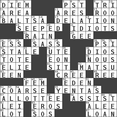 ACROSS 1. South Vietnam president (1954) 5. Pacific Standard Time (abbr.) 8. Three (prefix) 11. Length times width 12. Ancient Greek god of war 13. Friend of Pooh 14. Greek mezzo-soprano Agnes 17. Conveyance 19. Oozed 21. Foolish or stupid persons 22. Precipitation 23. Unit of force equal to gravity 24. Curvy letter 27. Backtalk 29. 23rd letter of the Greek alphabet 32. Having lost freshness 34. Shoshoni 36. "Vaya con ____" 37. Carryall 38. A really long time 39. Horse sense 40. Writer Wiesel 41. Be seated 42. Taiwanese island in East China Sea 43. Car or cant ending 44. Algonquian 46. To sift 47. Opposite of masc. 50. Paradise 52. Unrefined 55. Gossips 57. One to whom something is allotted 59. Aid 62. Luau accessory 63. Greek god of love 64. Toward shelter 65. Car dealer's back yard 66. Mayday 67. Grant temporary use of DOWN 1. Small moist lump or mass 2. Retirement account (abbr.) 3. Snakelike fish 4. Mother 5. Before (prefix) 6. Former Milwaukee Brewers owner Bud 7. Sadhe (variant) 8. Musical group of three 9. Carrot, for example 10. Charged atoms 12. Find the sum of 15. Gospel singer Marvin 16. Capital of Western Samoa 18. Neckwear 20. Takes place subsequently 24. First name in cosmetics 25. Took without asking 26. Smooth fabric 28. Unemotional 29. Peter (Polish) 30. Lush 31. Come out of 33. Area sheltered from the wind 35. Main course 36. Heredity factor (abbr.) 42. Confronts 45. Pulitzer Prize-winning author Ferber 47. Back 48. _____ Park, CO 49. Paris' subway 51. Relating to the nose 52. Give a ring to 53. Butter sub 54. Came down and settled, as after flight 55. It is so 56. Grain storage tower 58. Greek goddess of the dawn 60. Ocean 61. Nine, plus one