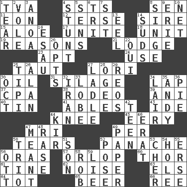 ACROSS 1. Federal power corp. 4. Fast planes 8. Elected rep. 11. Age 12. Laconic 14. Father 15. _ vera 17. Join together 18. A single undivided whole 19. Thinks logically 21. Inn 23. Fitting 24. Purpose 25. Drawn tight 27. Australian parrot (variant) 30. Lubricate 31. Fodder prepared in a silo 34. Pet locale 37. Accounting whiz (abbr.) 38. Cowboy competition 39. Black tropical American cuckoo 40. Metal container 41. Most capable 43. Binary compound 44. Leg joint 45. Suggestive of the supernatural 47. Medical imaging device (abbr.) 49. For each 50. Pulls apart 52. Flamboyance 56. Mouths or openings 57. Lowest deck of a ship 60. Son of Odin 61. Prong on a fork 62. Annoying sound 63. Raised railways 64. Small child 65. Fermented drink made from hops 66. To sift DOWN 1. Pull apart 2. Short-tailed, large-bodied rat 3. Small Philippine buffalo 4. Check the growth or development of 5. Elected reps. 6. Three (prefix) 7. Fast jet (abbr.) 8. Burn superficially 9. 4th largest of the Great Lakes 10. Fish or hair follower 13. Snakelike fish 14. Beer foam 16. He sold his birthright 20. Chooses 22. Fr. "Yes" 25. Native american tent (variation) 26. Actor Alda or Thicke 27. Dipping utensil 28. Double curve, resembling the letter S 29. Vintage cars 30. Sep. follower 32. SW Asia republic 33. Ear part 34. Den 35. Actor Griffith 36. Sliced dessert 42. Adolescent 44. Apertif with cassis 46. Part of Q.E.F. 47. Intended 48. Raze (variant) 49. Some stationery 50. Musical group of three 51. Male child 52. Airs 53. "Mermaids" star 54. Opening into or through something 55. Celtic language 56. Baseball player Mel 58. Director Reiner 59. Falsehood