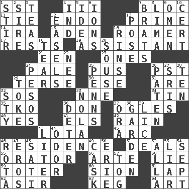 ACROSS 1. Fast jet (abbr.) 4. One more than two 7. Coalition 11. Standoff 12. Inside; within (prefix) 13. A-one 14. Retirement account (abbr.) 15. Arabian gulf 16. Nomad 17. Musical pauses 19. Aide 21. Car or cant ending 23. Singles 24. Light colored 25. Tenth month of the Hindu calendar 26. Pacific Standard Time (abbr.) 29. Laconic 30. Compass dir. 31. "We ___ not amused" (Victoria) 32. Mayday 33. Compass dir. 34. Metal container 35. Ring climax 36. Spanish title 37. Stares 40. Consenting reply 41. Raised railways 42. Water falling in drops from the sky 43. Globular water bottle used in Asia 45. Curve 46. Home 51. Allots cards 55. Speaker 56. Johnson of "Laugh-In" 58. Whopper 59. Carrier 60. The Jewish people; Israel 61. Infant locale 62. SW Saudi Arabia district 63. Barrel 64. Nonscientific branch of learning DOWN 1. Tumult 2. Beget 3. Afternoon social gatherings 4. Indiana (abbr.) 5. The content of cognition 6. Charged atoms 7. Naughty children 8. Pale green bean 9. Sign of things to come 10. Foregone conclusion 12. Artist's stands 13. Introduce or present, as a question 16. Wash lightly 18. Rend 20. Boozer 22. Born 24. Mexican monetary units 25. Actor Sean's family 26. Eucharist need 27. Indian titles of respect 28. Nine, plus one 29. Puff or smoke 32. Filthy place 33. Pitcher Ryan 36. Prevent from occurring 37. Mouth or opening 38. Place where plants grow 39. Louse (plural) 43. 61 cubic inches 44. Scent 46. Round or rotation of duties 47. Greek god of love 48. Suttee (variant) 49. Keg 50. One of the Great Lakes 52. Silent film actress Nazimova 53. One who doesn't tell the truth 54. Back-to-school mo. 57. Coat; cloak