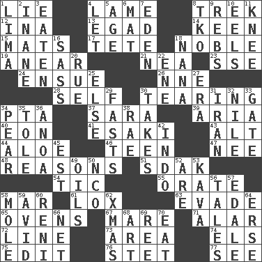 ACROSS 1. Whopper 4. Unable to walk 8. Long journey 12. _ tizzy (2 wds.) 13. Mild oath 14. Peachy ____! 15. Floor coverings 17. False hair 18. Impressive in appearance 19. Approach 21. Teachers' org. 23. Compass dir. 24. Follow as a consequence or result 26. Compass dir. 28. Oneself 30. Lacerating 34. Parent Teacher Assoc. 37. "Two Mules for Sister ____" 39. Roberta Peters solo 40. Age 41. 1973 Nobel Price Winner (Physics) Leo 43. Keyboard modifier key 44. _ vera 46. Adolescent 47. Born 48. Thinks logically 51. Neighbor of Neb. 54. Nervous spasm 55. Speak pompously 58. Spoil 61. Brine-cured salmon 63. Elude 65. Baking chambers 67. Female horse 71. Having or resembling wings 72. Actor's bit 73. Length times width 74. Raised railways 75. Prepare for publication 76. Proofreading order 77. Perceive with the eye DOWN 1. Pale green bean 2. Silly 3. Ingested 4. Allow 5. Ripen 6. Floor protector 7. Paradise 8. Ring climax 9. Confederate soldiers (slang) 10. Snakelike fish 11. Leg joint 16. Backtalk 18. Grandmother 20. Sorrow 22. Compass dir. 25. Otherwise 27. Epoch 29. Goes without food and/or water 30. Proceeds 31. SW Asia republic 32. "Death on the ____" 33. Yard entry 34. Lightbulb-shaped fruit 35. Lacquered or enameled metalware 36. Small Philippine buffalo 38. Actress Charlotte 42. _ china 45. Eastern Standard Time (abbr.) 49. Petroleums 50. Non-commissioned officer (abbr.) 52. "We ___ not amused" (Victoria) 53. Polynesian shrub of the pepper family 56. Stories 57. Peak District village in England 58. Undercover agent 59. Enthusiastic 60. Painter Guido (1575-1642) 62. Dec. holiday 64. Celtic language 66. Fish or hair follower 68. Nonscientific branch of learning 69. Portuguese money of account (variant) 70. Consume