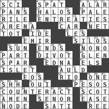 ACROSS 1. _-fi 4. Petty quarrel 8. Having or resembling wings 12. Zero-star reviews 14. Radiant circles of light 16. Diluted with white 17. Cause heat under the collar 18. Pleas 20. Sports stadium 22. 4-wheeled motor vehicle 23. Fish or hair follower 24. Small child 25. Binary compound 28. French article 30. Independent ruler or chieftain 31. Grain storage towers 35. Player for Phoenix 37. Conclusions 40. Words to Nanette 41. Piece 42. A piece of turf (Scot.) 44. Small, secluded valley 45. Practice fight 46. Pulitzer Prize-winning author Ferber 47. Raised railways 48. Small island 50. Old (Scot.) 52. Greek goddess of the dawn 54. _ de Janeiro 55. Single 58. Quiet! 61. Fr. "Yes" 63. Mexican monetary units 65. Neutralize 70. Highlander 71. So be it 72. Sir (Sp.) 73. Comfort 74. Thickened enlargement 75. Suttee (variant) 76. To riddle DOWN 1. Small fatty European fish 2. Capital of Egypt 3. An arm off of a larger body of water 4. A female animal or person 5. Baking dish 6. The first octave above the treble staff 7. Torque (variant) 8. Fitting 9. (Had) reclined 10. Toward shelter 11. Take ten 13. Elected rep. 15. Lick closed 19. Ancient Greek god of war 21. Direct toward a target or goal 26. Passed on 27. Bert's buddy 29. Burned superficially 30. Main course 32. Hang loosely or laxly 33. Singles 34. Manchild 35. Plant excrements 36. Mountain range 38. Movie disc 39. Underwater navigation system 41. 23rd letter of the Greek alphabet 43. "Change" in Tahitian 49. A blast of a horn 51. Trim (branches) 53. Takes to court 55. Motion picture award 56. Trap for birds or small mammals 57. First name in cosmetics 58. Skim 59. Same (prefix) 60. Became colored 62. Angers 64. Compass dir. 66. Compass dir. 67. Santa ___, CA 68. Small bed 69. Three (prefix)