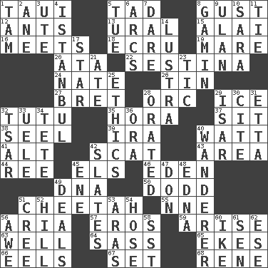 ACROSS 1. "Change" in Tahitian 5. Bit 8. Abrupt rush of wind 12. Pismires 13. Mountain range 15. Jai ____ 16. Confronts 18. Shade of tan 19. Female horse 20. _ moment's notice (2 wds.) 22. French poetic form 24. Nathan's nickname 26. Metal container 27. Cy Young winner Saberhagen 28. The grampus (Milton) 29. Frozen water 32. Ballerina skirt 35. Israeli folk dance 37. Be seated 38. Stitch closed the eyes of (a falcon) 39. Retirement account (abbr.) 40. Electrical Unit 41. Keyboard modifier key 42. Go away! 43. Length times width 44. Portuguese money of account (variant) 45. Raised railways 46. Paradise 49. Heredity factor (abbr.) 50. Texas town _ City 51. Leopard's kin 55. Compass dir. 56. Operatic vocal solo 57. Greek god of love 59. Get up 63. Not ill 64. Backtalk 65. Makes supply last 66. Snakelike fish 67. Put into a specified state 68. French philosopher Descartes DOWN 1. Scottish cap 2. A saturated hydrocarbon 3. Shoshoni 4. Byzantium, centuries later 5. Third day of the wk. 6. Arches 7. Have the gumption 8. Street urchin 9. ____ Bator, Mongolia 10. "Two Mules for Sister ____" 11. Make a knot 14. A period of five years 17. Play the lead 21. Had dinner 23. Nervous spasm 25. Moral principles 28. Declaimed 29. Austrian river, tributary to the Danube 30. Quote 31. Singer James 32. Russian ruler of old 33. Ubangi River tributary 34. False hair 36. Mouth or opening 40. Roamer 42. Chalkboards 45. Compass dir. 47. Spanish title 48. Pulitzer Prize-winning author Ferber 49. Allots cards 51. Algonquian 52. Land elevation 53. Ancient river in northeast Turkey 54. Stockings 56. Deep reverence 58. Fast jet (abbr.) 60. Mamie's mate 61. Elected rep. 62. Compass dir.