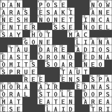 ACROSS 1. One of the 12 tribes of Israel 4. Introduce or present, as a question 8. At this time 11. Ancient river in northeast Turkey 13. 1973 Nobel Price Winner (Physics) Leo 15. A saturated hydrocarbon 16. Delicate 17. Music written for nine 18. South American Indian 19. Keyboard key 21. Compass dir. 22. Christmas carol 23. Declare 24. Being at a high temperature 27. Big _ 29. Went 30. Climbing, woody, usually tropical vines 34. The 19th letter of the Greek alphabet 36. Have the gumption 39. Goodbye (Sp.) 40. 90 degrees 41. U. of Maine site 43. Pulitzer Prize-winning author Ferber 44. Leaves out 46. Fly high 47. Modern: prefix 48. Upset 49. Drawn tight 51. Portuguese money of account (variant) 53. Followers of ems 54. Health resort 57. Israeli folk dance 60. Atmosphere 63. Ferber et al. 65. Relating to the mouth 66. Fur scarf 69. I made a mistake 70. Floor protector 71. Consumed 72. Length times width 73. Compass dir. 74. Put down 75. Three (prefix) DOWN 1. Natives or inhabitants of Denmark 2. Sports stadium 3. Thoroughly unpleasant 4. Animal enclosure 5. Bear (Spanish) 6. Without 7. Makes supply last 8. Billionth: prefix 9. Single time 10. Welt 12. A female animal or person 14. A whole individual unit 18. Happening 20. 17th letter of the Greek alphabet 25. Southwest Nigerian state 26. Pulls apart 28. According to 29. From the throat 31. Helper 32. Words to Nanette 33. White ___ sheet 34. Pack (down) 35. SW Saudi Arabia district 37. Friend of Pooh 38. Related on the mother's side 40. Greek goddess of the dawn 42. Northwest Algerian city 45. Perceive with the eye 50. Purpose 52. Comfort 54. Derisive sound 55. Some stationery 56. Slender Brazilian palm 57. Residence 58. Mouths or openings 59. Pace 61. Slanted text style (abbr.) 62. Round or rotation of duties 64. ___ good deed 67. Luau accessory 68. Conclusion