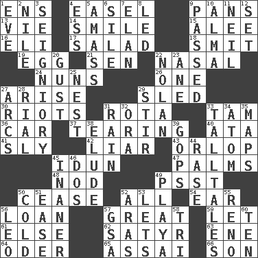 ACROSS 1. Followers of ems 4. Artist's stand 9. Baking dishes 13. Compete 14. Grin 15. Toward shelter 16. Biblical high priest 17. First course 18. Stricken, poetically 19. Ovum 21. Elected rep. 22. Rhinal 24. Religious women 26. Single 27. Ascend 29. Downhill vehicle 30. Debaucheries 31. Round or rotation of duties 33. Scottish cap 36. 4-wheeled motor vehicle 37. Separating forcefully 40. "One Day ___ Time" 41. Insidious 42. One who doesn't tell the truth 43. Lowest deck of a ship 45. Goddess of spring and wife of Bragi 47. Insides of hands 48. Dreamland 49. Inconspicuous attention getter 50. Desist 52. Everything 54. Ewer handle 56. Grant temporary use of 57. Relatively large 59. Allow 61. Otherwise 62. Letch 63. Compass dir. 64. Baltic tributary 65. Slender Brazilian palm 66. Boy, to dad DOWN 1. Night before a holiday 2. "Death on the ____" 3. Signiory (variant) 4. Curvy letter 5. Collect or gather 6. Drop; flow; fall 7. Flair 8. Directed 9. Went by 10. _ mater 11. Famous astronaut Armstrong 12. Put into a specified state 20. Abrupt rush of wind 22. Pitcher Ryan 23. A saturated hydrocarbon 25. A home for chicks 27. Arches 28. Monetary unit of Yemen 29. Use a spoon 31. Precipitation 32. Mouth or opening 33. Baron Munchausen's specialties 34. Smallest unit of an element 35. Atlas contents 38. Dodge 39. Republicans 44. To erase 45. More empty; more void 46. Two (Sp.) 49. Beach, in Buenos Aires 50. Lacking warmth 51. Comfort 52. Ancient river in northeast Turkey 53. Allows 55. Western Nevada city 56. Lion 57. Girls' org. (abbr.) 58. Three (prefix) 60. Nine, plus one