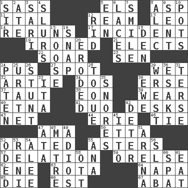 ACROSS 1. Backtalk 5. Raised railways 8. Cleo's killer 11. Slanted text style (abbr.) 12. 480, 500 or 516 sheets of paper 13. Lion 14. Summer TV shows 17. Happening 19. Pressed 21. Opts 22. Fly high 23. Elected rep. 24. Tenth month of the Hindu calendar 27. Blemish 29. Dripping 32. Nick name for Arthur 34. Two (Sp.) 36. Celtic language 37. Pulled tight 38. Period of immesurable duration 39. Put on (as clothing) 40. Inactive volcano in Sicily 41. Superhero pair 42. Writing tables 43. Fish or hair follower 44. 4th largest of the Great Lakes 46. Standoff 47. Housemaid (var.) 50. Singer James 52. Declaimed 55. Michaelmas daisies 57. Conveyance 59. Threatening words 62. Compass dir. 63. Round or rotation of duties 64. California wine valley 65. Pass on 66. Eastern Standard Time (abbr.) 67. Blind as ____ DOWN 1. Title for a knight 2. Had dinner 3. Indian skirt 4. Disparaging remarks 5. Car or cant ending 6. Shoestrings 7. Grin 8. Actor Baldwin 9. Transmitted 10. Cooking vessels 12. To free from 15. Trap for birds or small mammals 16. Fastener 18. Lair 20. Eaten away 24. Eucharist need 25. A salt of uric acid 26. Check the growth or development of 28. Woman's close-fitting hat 29. Take or capture by force 30. 1973 Nobel Price Winner (Physics) Leo 31. Laconic 33. Call ___ day 35. Sounds asleep 36. She-sheep 42. Prevent from occurring 45. "Tell ____ the Marines!" 47. _ moment's notice (2 wds.) 48. Distance measurement (Brit.) 49. Goodbye (Sp.) 51. Sports stadium 52. Wrote a lyric poem 53. Painter Guido (1575-1642) 54. Toward shelter 55. Santa ___, CA 56. Thick slice 58. Baseball player Mel 60. Health resort 61. Consume
