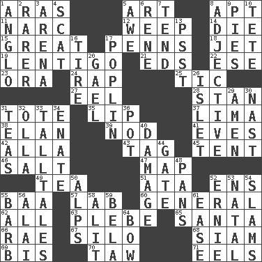 ACROSS 1. Ancient river in northeast Turkey 5. Tate display 8. Fitting 11. Drug cop 12. Shed a tear 14. Expire 15. Relatively large 17. Actor Sean's family 18. Type of plane 19. Small, flat, pigmented spot on the skin 21. Begley and Asner 22. Compass dir. 23. Mouth or opening 24. Strike 25. Nervous spasm 27. Snakelike fish 28. Comedian Laurel of Laurel & Hardy 31. Carryall 35. Mouth edge 37. Pale green bean 38. Liveliness 39. Dreamland 41. Nights before holidays 42. Silent film actress Nazimova 43. Label 45. Portable shelter 46. Table seasoning 47. Atlas unit 49. Beverage made from leaves 51. _ moment's notice (2 wds.) 52. Followers of ems 55. Sound made by sheep 57. Experiment locale 60. Commissioned military rank 62. Everything 63. Cadet 65. Before Barbara or Clara 66. Actress Charlotte 67. Grain storage tower 68. Thailand, formerly 69. Altar cloth linen 70. The 23rd letter of the Hebrew alphabet 71. Snakelike fish DOWN 1. White American of non-Hispanic descent 2. More uncommon 3. Sports stadium 4. Leave at once 5. Deep reverence 6. French philosopher Descartes 7. Look after 8. Descriptive word 9. Sliced desserts 10. Wig 13. Inconspicuous attention getter 16. Become fatigued 17. Cotton for raincoats, e.g. 20. Highlander 26. Small island 29. So be it 30. Political cartoonist Thomas 31. Afternoon social gatherings 32. Rounded earthenware pot or jar 33. Baron Munchausen's specialties 34. Related on the mother's side 36. Plant holder 40. Break 44. Yard entry 48. Baking dishes 50. High mountains 52. Bert's buddy 53. Relating to or accompanying birth 54. Hits or strikes with great force 55. Sharp remark 56. Jai _ 58. Set down 59. Actor Lugosi 61. Comfort 64. Ribbon knot