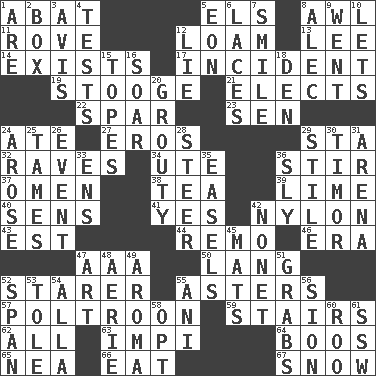 ACROSS 1. Blind as ____ 5. Raised railways 8. Leather borer 11. Be footloose 12. Rich soil 13. Area sheltered from the wind 14. Has an existence 17. Happening 19. Moe Howard, for one 21. Chooses 22. Practice fight 23. Elected rep. 24. Had dinner 27. Greek god of love 29. R.R. building 32. All-night dance parties 34. Shoshoni 36. Use a spoon 37. Sign of things to come 38. Afternoon social gathering 39. Welles in "The Third Man" 40. Elected reps. 41. It is so 42. Thermoplastic polyamide 43. Eastern Standard Time (abbr.) 44. San ____ (Riviera town) 46. Epoch 47. Auto club (abbr.) 50. Long (Scottish) 52. A viewer who gazes fixedly 55. Michaelmas daisies 57. Characterized by complete cowardliness 59. Flight of steps 62. Everything 63. Body of Kaffir warriors 64. Expressions of contempt or scorn 65. Teachers' org. 66. Consume 67. Overwhelm DOWN 1. "We ___ not amused" (Victoria) 2. Gift holder 3. Opinion 4. Trials 5. Period of immesurable duration 6. Shoestrings 7. Grin 8. Actor Baldwin 9. Gone 10. Allows 12. Falsehood 15. Drinks excessively 16. Fly high 18. Lair 20. Sullen 24. Came up 25. Makes less strong or intense 26. Happening 28. Navigate 29. Vertical member of a panel or frame 30. Southeast Indonesia island 31. Sports stadium 33. Followers of ems 35. Artist's stands 36. Insidious 42. Music written for nine 45. Floor protectors 47. Tate display 48. Nest on high 49. Scent 51. Takes hold of 52. Connect, as a bridge 53. Lacquered or enameled metalware 54. Silent film actress Nazimova 55. Cuckoo 56. The Jewish people; Israel 58. Elect 60. Friend of Pooh 61. Compass dir.