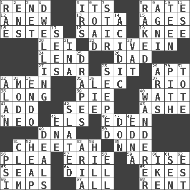 ACROSS 1. Tear apart 5. ___ a Wonderful Life 8. Pace 12. Afresh 13. Round or rotation of duties 15. Grows older 16. _____ Park, CO 18. Ketch in the Levant 19. Leg joint 20. Luau accessory 22. Popular '50s hangout 24. Grant temporary use of 26. June honoree 27. Austrian river, tributary to the Danube 28. Be seated 29. Fitting 32. So be it 35. Actor Baldwin 37. _ de Janeiro 38. Yearn 39. Sliced dessert 40. Electrical Unit 41. Say or write further 42. Ooze 43. American tennis player Robert 44. Modern: prefix 45. Raised railways 46. Genesis locale 49. Heredity factor (abbr.) 50. Texas town _ City 51. Leopard's kin 55. Compass dir. 56. Entreaty 57. One of the Great Lakes 59. Originate 63. Lick closed 64. Deli pickle 65. Supplements with great effort 66. Naughty children 67. Everything 68. Monthly bill DOWN 1. Actress Charlotte 2. Followers of ems 3. Fish or hair follower 4. Residence 5. Big collection agency 6. Frog relative 7. Disorderly outburst 8. Moved through 9. Hindu god of fire 10. Adolescent 11. Compass dir. 14. Being or containing an acid 17. Perceives with the eye 21. _ tizzy (2 wds.) 23. Large container 25. Window treatments 28. Oozed 29. Ancient river in northeast Turkey 30. Essential or central part 31. Lug 32. Actor Alda or Thicke 33. Method 34. Inside; within (prefix) 36. Falsehood 40. Nomad 42. Scheduled 45. Compass dir. 47. Spanish title 48. Pulitzer Prize-winning author Ferber 49. Allots cards 51. Clement's nick name 52. Pile 53. Operatic vocal solo 54. Land elevation 56. 23rd letter of the Greek alphabet 58. Pipe bend 60. Mamie's mate 61. Elected rep. 62. Eastern Standard Time (abbr.)