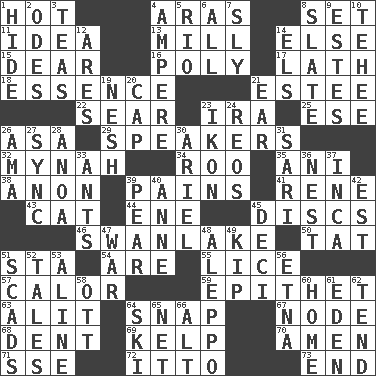 ACROSS 1. Being at a high temperature 4. Ancient river in northeast Turkey 8. Put into a specified state 11. It may be bright or harebrained 13. Place where flour is made 14. Otherwise 15. Letter starter 16. Much (prefix) 17. Thin strip of wood or metal 18. Center 21. First name in cosmetics 22. Shrivel 23. Lyricist Gershwin 25. Compass dir. 26. White ___ sheet 29. Orators 32. Non-adult bird? 34. Friend of Pooh 35. Black tropical American cuckoo 38. Soon (poet.) 39. Aches 41. French philosopher Descartes 43. Domesticated feline 44. Compass dir. 45. Plates 46. Tchaikovsky ballet 50. Make lace 51. R.R. building 54. "We ___ not amused" (Victoria) 55. Louse (plural) 57. Bodily heat indicating an inflammation 59. Curse 63. Set down 64. Fastener 67. Connecting point 68. Scratch 69. Seaweed 70. So be it 71. Compass dir. 72. "Tell ____ the Marines!" 73. Conclusion DOWN 1. Flintstone garb 2. Lyric poems 3. Afternoon social gatherings 4. Electrical Unit 5. River (Sp.) 6. Everything 7. Mischievous 8. Chalkboard 9. _____ Park, CO 10. Giggle 12. Ancient Greek god of war 14. Raised railways 19. Tender 20. Head covering 21. Hearing organ 23. Image 24. Vintage cars 26. Wet nurse (var.) 27. Synchronize (abbr.) 28. Small Philippine buffalo 30. Satellite of Uranus 31. Indian skirt 33. Pismires 36. A home for chicks 37. South American Indian 39. Lightbulb-shaped fruit 40. Singer Murray 42. Eastern Standard Time (abbr.) 45. Tenth: prefix 47. Armed conflict 48. City in Syria 49. Monetary unit of Laos 51. Tons 52. Falsehoods 53. Place in a line 56. Inactive volcano in Sicily 58. Baseball player Mel 60. Dwelling 61. Genesis locale 62. Be inclined (to) 64. What Jean-Claude Killy likes to do 65. Fish or hair follower 66. The first octave above the treble staff