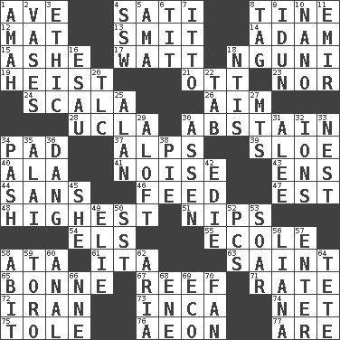 ACROSS 1. "___ Maria" 4. Suttee (variant) 8. Prong on a fork 12. Floor protector 13. Stricken, poetically 14. First of billions? 15. American tennis player Robert 17. Electrical Unit 18. Group of southern Bantu languages 19. Robbery 21. Baseball player Mel 23. Or not 24. Any of the three canals of the cochlea 26. Direct toward a target or goal 28. Southern CA. univ. 30. Refrain by choice 34. Writing tablet 37. High mountains 39. A type of plum 40. Chicken ___ king 41. Annoying sound 43. Followers of ems 44. Without 46. Nourish 47. Eastern Standard Time (abbr.) 48. Having the greatest elevation 51. Cuts off 54. Raised railways 55. Learning spot: Fr. 58. _ moment's notice (2 wds.) 61. Call ___ day 63. Inhabitant of Heaven 65. Child's nurse 67. Coral collection 71. Pace 72. SW Asia republic 73. South American Indian 74. Fish or hair follower 75. Lacquered or enameled metalware 76. A really long time 77. "We ___ not amused" (Victoria) DOWN 1. Nanny 2. Flower holders 3. Moral principle 4. Compass dir. 5. Nanny (var.) 6. Teat (slang) 7. "Tell ____ the Marines!" 8. Label 9. Goddess of spring and wife of Bragi 10. Billionth: prefix 11. Arab leader 16. He sold his birthright 18. Nuclear Threat Initiatives 20. Affectionate concern, for short 22. Keyboard key 25. ____ Jay Lerner 27. Mountains (abbr.) 29. At or to great height 30. NE Netherlands city 31. Toward shelter 32. Charged atoms 33. A home for chicks 34. Romantic infatuation 35. Mountain range southwest of Kyrgyzstan 36. Mild oath, euphamism for damn 38. Sliced dessert 42. Singer Brickell 45. A female animal or person 49. Writer Wiesel 50. Fast jet (abbr.) 52. Personal Computers (abbr.) 53. Fly high 56. Woody, climbing, usually tropical plant 57. Keyboard key 58. "This won't hurt ____!" 59. "Corrida" creature 60. Of or related to the anus 62. Operatic vocal solo 64. Wig 66. Compass dir. 68. Compass dir. 69. Environmental prefix 70. Air blower