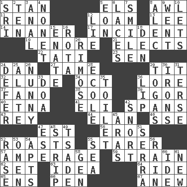 ACROSS 1. Comedian Laurel of Laurel & Hardy 5. Raised railways 8. Leather borer 11. Western Nevada city 12. Rich soil 13. Area sheltered from the wind 14. More lacking in sense or substance 17. Event 19. Poe poem 21. Opts 22. Jacques of French films 23. Elected rep. 24. One of the 12 tribes of Israel 27. Docile 29. Teat (slang) 32. Dodge 34. Sep. follower 36. Old wives' tales, e.g. 37. Papal veil 38. "Barney Miller" actor Jack 39. Composer Stravinsky 40. Inactive volcano in Sicily 41. Connecticut Ivy Leaguer 42. Connects, as a bridge 43. Marina Del _, California 44. Enthusiasm 46. Compass dir. 47. Eastern Standard Time (abbr.) 50. Greek god of love 52. Cooks with dry heat, as in an oven 55. A viewer who gazes fixedly 57. Electrical Measurement 59. Put through a sieve 62. Arrange properly for use 63. The main thing one is thinking about 64. Travel on an animal 65. Followers of ems 66. Animal enclosure 67. Afresh DOWN 1. Indian title of respect (Mr.) 2. "___ Little Indians" 3. Of or related to the anus 4. Music written for nine 5. Period of immesurable duration 6. Shoestrings 7. Grin 8. Actor Baldwin 9. Gone 10. Allows 12. Falsehood 15. Maternal 16. Roll call or roster of names 18. Lair 20. Full of chinks, cracks, or crevices 24. Put off 25. Having winglike extensions 26. Pet term 28. Learning spot: Fr. 29. Ancient Roman robes 30. Metal shackles 31. Laconic 33. ___ good deed 35. Bathroom 36. Mouth edge 42. Derisive sound 45. Caspian sea tributary 47. Compass dir. 48. Long narrow piece of something 49. Sadhe (variant) 51. Spanish missionary in California 52. Raze (variant) 53. Sign of things to come 54. Flats, for short 55. Ocean 56. Precipitation 58. Commissioned mil. rank 60. Binary compound 61. ___ Haven, CT