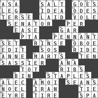 ACROSS 1. White ___ sheet 4. Table seasoning 8. Leaves 12. Part of a journey 13. The main thing one is thinking about 14. Lyric poems 15. Laconic 18. Put down 19. Short-tailed, large-bodied rat 20. Elected representative 22. For each 23. Relaxation 24. Slender fish 25. Parent Teacher Assoc. 26. Pre-World Series prize 30. Put into a specified state 33. Wash lightly 36. Mitch Miller's instrument 37. Prepare for publication 39. Distress signal 40. Travel on or in a vehicle 41. Queen of England 1702-14 42. Shops 44. "___ Little Indians" 45. More disrespectful 47. Santa ___, CA 50. Small child 51. Chest bones 53. Storage container 54. Paper fasteners 57. Actor Baldwin 59. Mine, in Marseilles 61. Actors Connery and Penn 63. Christmas carol 64. SW Asia republic 65. Standoff 66. Jane of fiction 67. Hoop that covers a wheel 68. Health resort DOWN 1. Keyboard modifier key 2. Perceives with the eye 3. Match 4. Grain storage tower 5. The sixth month of the Jewish calendar 6. Flowery wreath 7. Bit 8. Head of state? 9. Aroma 10. Snakelike fish 11. Compass dir. 16. Fastener 17. 90 degrees 21. Pull into pieces 22. Baking dish 24. Turn to the right 26. Inconspicuous attention getter 27. "This won't hurt ____!" 28. Thickened enlargement 29. Adolescent 30. Oceans 31. Pulitzer Prize-winning author Ferber 32. Canisters 34. Austrian river, tributary to the Danube 35. Not either 38. A testis 42. Was introduced to 43. "Two Mules for Sister ____" 46. Electrically charged atom 48. Pinches, bites 49. Competent 52. Theater features 53. Fermented drink made from hops 54. Fly high 55. Prong on a fork 56. Clip 57. One (Scot) 58. Myrna of the movies 59. Small island 60. Medical imaging device (abbr.) 62. Ocean