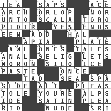 ACROSS 1. Beverage made from leaves 4. Plant excrements 8. Adept person 11. Bowlike part 13. Lowest deck of a ship 15. Or not 16. To (old English) 17. Any of the three canals of the cochlea 18. "Corrida" creature 19. Peter (Polish) 21. Affirmative reply 22. Conclusions 23. Car or cant ending 24. Say or write further 27. Actor Linden 29. Capital of Western Samoa 30. Food holder 34. Leather borer 36. Singles 39. Lies 40. Of or related to the anus 41. Former Milwaukee Brewers owner Bud 43. Allows 44. Person of subnormal intelligence 46. Grain storage tower 47. Frozen water 48. Thick mixture 49. At one time in the past 51. Small boy 53. Ocean 54. Health resort 57. A type of plum 60. The first octave above the treble staff 63. Entreaties 65. Lacquered or enameled metalware 66. You are 69. High mountains 70. Binary compound 71. Smooth fabric 72. Entreaty 73. _ de Janeiro 74. Naked 75. _ Lanka DOWN 1. Grayish beige 2. Bert's buddy 3. 13-14th century defensive garment 4. Distress signal 5. Curve 6. Live dramatic performance 7. Flatfish 8. At once, immediately (arch.) 9. Drawstring 10. Greek god of love 12. Being at a high temperature 14. Romantic infatuation 18. Copy Pinocchio 20. Reproach for some lapse or misdeed 25. "Vaya con ____" 26. Natives or inhabitants of Denmark 28. Fitting 29. One to whom something is allotted 31. Actor Baldwin 32. Wig 33. Curvy letter 34. Small Philippine buffalo 35. Armed conflicts 37. Connecticut Ivy Leaguer 38. Grain storage towers 40. Electrical Unit 42. Went 45. Teachers' org. 50. Head covering 52. 24-hour periods 54. Exchanges for money 55. Some stationery 56. Slender Brazilian palm 57. Commotion 58. Farming town in central California 59. Butter sub 61. Grant temporary use of 62. Ballerina skirt 64. Pet locale 67. To free from 68. Compass dir.