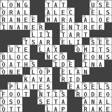 ACROSS 1. Protracted 5. Make lace 8. Purpose 11. Relating to the mouth 12. Actor Baldwin 14. Raised railways 15. Indian princess (variant) 17. Hindu Mythology: god of death 18. Medicinal plant 19. More lacking in sense or substance 21. Main course 23. Cards in a Roman deck? 25. Small pie 26. Russian ruler of old 27. Connecticut Ivy Leaguer 28. Observe 31. Shoshoni 33. Not strict 35. Leaves out 37. Group of countries in special alliance 38. Non-commissioned officer (abbr.) 40. Immeasurably long periods of time 41. Curses 43. Binary compound 45. _ tizzy (2 wds.) 46. Single 47. Trim (branches) 50. Liveliness 52. Polynesian shrub of the pepper family 53. To free from 54. Food holders 56. Artist's stands 61. Pick up the tab 62. Nuclear Threat Initiatives 65. Cowboy competition 66. Bear (Spanish) 67. Stalk of a moss capsule 68. Of or related to the anus 69. Baseball player Mel 70. Pet locale 71. Immoral or dissolute person DOWN 1. Australian parrot (variant) 2. NW Algerian seaport 3. Grandmother 4. Small, secluded valley 5. Scottish cap 6. Insect wing 7. Cigar-shaped 8. Ubangi River tributary 9. _ gin 10. Compass dir. 13. Lessep's creation 16. Snakelike fish 18. Nonscientific branch of learning 20. Monetary unit of Yemen 22. Musical group of three 24. SW Asia republic 26. Georgia ____ (Atlanta school) 28. The Jewish people; Israel 29. Inactive volcano in Sicily 30. Double-curved letter 31. ____ Bator, Mongolia 32. Haul 34. One more than ninety 36. Chow _ 37. Oct. 31 cry 39. River in Europe 42. Narrow board 44. Writer Wiesel 48. Baking chambers 49. Soft color 51. The sixth month of the Jewish calendar 52. Krazy ___ of comics 54. Mail 55. Spoils 57. Fly high 58. Pulitzer Prize-winning author Ferber 59. Path through which fluid escapes 60. Flatfish 61. Egg _ yung 63. Call ___ day 64. Plant excrement