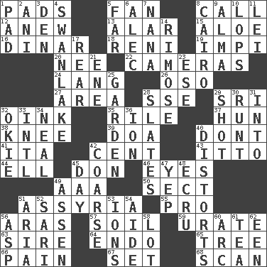 ACROSS 1. Groovy apts. 5. Air blower 8. Give a ring to 12. Afresh 13. Having or resembling wings 15. Medicinal plant 16. Middle Eastern gold or silver currency 18. Painter Guido (1575-1642) 19. Body of Kaffir warriors 20. Born 22. Devices for capturing images 24. Austrian-born American filmmaker Fritz 26. Bear (Spanish) 27. Type of rug 28. Compass dir. 29. Indian title of respect (Mr.) 32. Pig sound 35. Cause heat under the collar 37. Attila the _ 38. Leg joint 39. ___ good deed 40. Do not 41. Call ___ day 42. Penny 43. "Tell ____ the Marines!" 44. Pipe bend 45. Spanish title 46. Snake ____ (dice throw) 49. Auto club (abbr.) 50. Religious group 51. Nineveh was its capital 55. Adept person 56. Caspian sea tributary 57. Earth 59. A salt of uric acid 63. The founder of a family 64. Inside; within (prefix) 65. Family _ (genealogy) 66. Ache 67. Arrange properly for use 68. Examine minutely or intensely DOWN 1. Groovy apt. 2. Black tropical American cuckoo 3. Lair 4. Tchaikovsky ballet 5. At a great distance 6. Actor Baldwin 7. Nanny 8. Capital of Egypt 9. _ mater 10. Chops off 11. Flowery wreath 14. Full of chinks, cracks, or crevices 17. Hitchcock's "____ Window" 21. Compass dir. 23. Compass dir. 25. Place where plants grow 28. Chalkboards 29. Opportunity 30. Undersized animal 31. To the inside or interior of 32. Migrant worker of the '30s 33. International (abbr.) 34. Actress Patricia 36. Electrically charged atom 40. What propaganda does 42. Rough 45. 24 hours 47. Slangy assent 48. Shade of tan 49. NE Netherlands city 51. Roberta Peters solo 52. Indian skirt 53. Charged particles 54. Helper 56. Viper 58. Car dealer's back yard 60. Curve 61. Afternoon social gathering 62. Car or cant ending