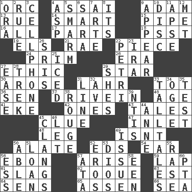 ACROSS 1. The grampus (Milton) 4. Slender Brazilian palm 9. First of billions? 13. Sorrow 14. Don Adams' spy role 15. Corncob 16. Everything 17. Actors' quests 18. Inconspicuous attention getter 19. Raised railways 21. Actress Charlotte 22. Component 24. Demure 26. Period 27. Principle of right and wrong 29. Play the lead 30. Came up 31. Cowardly lion portrayer 33. Small child 36. Elected rep. 37. Popular '50s hangout 40. Mature 41. Make supply last 42. Washington bills 43. Stories 45. A slight indication 47. An arm off of a larger body of water 48. Part of a journey 49. Is not 50. Having winglike extensions 52. Begley and Asner 54. Hearing organ 56. Inky black, to poets 57. Originate 59. Pet locale 61. Volcanic refuse 62. Woman's close-fitting hat 63. Eastern Standard Time (abbr.) 64. Elected reps. 65. NE Netherlands city 66. Ocean DOWN 1. Mouth or opening 2. General guideline 3. Portable communications device 4. Viper 5. Excessive but superficial compliments 6. "Two Mules for Sister ____" 7. Johnson of "Laugh-In" 8. ___ a Wonderful Life 9. Become visible 10. Flat circle 11. Domed church section 12. Was introduced to 20. Indian titles of respect 22. _ dish (used to culture cells) 23. Lyricist Gershwin 25. On the rocks 27. Comfort 28. Long journey 29. "______ My Girl" (Turtles hit) 31. Actor's bit 32. "___ Maria" 33. Baron Munchausen's specialties 34. Double curve, resembling the letter S 35. Trial 38. Makeup applied to the cheeks 39. Nuclear Threat Initiatives 44. Queen of England 1702-14 45. Gives out a loud, resonant sound 46. Allow 49. Come out of 50. Competent 51. Grant temporary use of 52. Greek god of love 53. "Vaya con ____" 55. To erase 56. Curvy letter 57. "One Day ___ Time" 58. Car or cant ending 60. Parent Teacher Assoc.