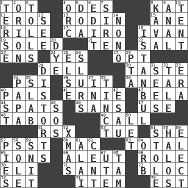 ACROSS 1. Small child 4. Lyric poems 8. Krazy ___ of comics 11. Greek god of love 13. "The Thinker" sculptor 15. A saturated hydrocarbon 16. Cause heat under the collar 17. Capital of Egypt 18. "Terrible" tsar 19. Having a sole or soles 21. Nine, plus one 22. Table seasoning 23. Followers of ems 24. Consenting reply 27. Elect 29. Small valley 30. Clothes sense 34. 23rd letter of the Greek alphabet 36. Costume for a special activity 39. Approach 40. Friends 41. Bert's buddy 43. Actor Lugosi 44. Arguments over trivial matters 46. Without 47. Purpose 48. Off limits 49. Give a ring to 51. Acura sports coupe 53. Third day of the wk. 54. A female animal or person 57. Inconspicuous attention getter 60. Apple computer (short form) 63. "_____ Recall" 65. Charged atoms 66. Native American of Southwest Alaska 69. Hero or heavy, e.g. 70. Connecticut Ivy Leaguer 71. Before Barbara or Clara 72. Alliance 73. Put into a specified state 74. A distinct part 75. Eastern Standard Time (abbr.) DOWN 1. Laconic 2. Greek mythologigal hunter 3. For Whom the Bell _____ 4. The grampus (Milton) 5. ___ good deed 6. Prepare for publication 7. The founder of a family 8. Polynesian shrub of the pepper family 9. Of or related to the anus 10. Portable shelter 12. Observe 14. Words to Nanette 18. Byzantium, centuries later 20. Color 25. Otherwise 26. Plays smoothly or legato 28. Parent Teacher Association (abbr.) 29. What propaganda does 31. Perceives with the eye 32. Falsehood 33. Epoch 34. Dad 35. Broad, flat, thick piece 37. _ tizzy (2 wds.) 38. Colored lightly or faintly 40. Pacific Standard Time (abbr.) 42. Son of Isaac 45. Mayday 50. Allow 52. Dec. holiday 54. Took without asking 55. Auras 56. Voters do this 57. Sliced desserts 58. Not divided or shared with others 59. In a ____ (agitated or irritated) 61. Jai _ 62. Penny 64. Globe 67. Shoshoni 68. Scottish cap