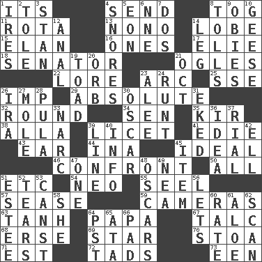 ACROSS 1. ___ a Wonderful Life 4. Transmit 8. Coat; cloak 11. Roll call or roster of names 13. Words to Nanette 14. Ear part 15. Flair 16. Singles 17. Writer Wiesel 18. Elected representative 21. Stares 22. Old wives' tales, e.g. 23. Curve 25. Compass dir. 26. Mischievous child 29. Utter; complete 32. One shot 34. Elected rep. 35. Apertif with cassis 38. Silent film actress Nazimova 39. It is permitted: Lat. 41. Singer Brickell 43. Hearing organ 44. _ tizzy (2 wds.) 45. Standard of perfection 46. Meet 50. 100% 51. And so on (abbr.) 54. Modern: prefix 55. Sew up the eyelids of hawks and falcons 57. Gospel singer Marvin 59. Devices for capturing images 63. Hyperbolic tangent 64. Dad 67. Baby powder 68. Celtic language 69. Play the lead 70. Portico 71. Eastern Standard Time (abbr.) 72. Small boys 73. Car or cant ending DOWN 1. Angers 2. Lacquered or enameled metalware 3. Comedian Laurel of Laurel & Hardy 4. Sounds asleep 5. A really long time 6. Compass dir. 7. Two (Sp.) 8. For Whom the Bell _____ 9. Off-Broadway awards 10. Honkers 12. Of or related to the anus 14. Part of a journey 19. Frog relative 20. Globe 21. Sep. follower 23. Toward shelter 24. The smallest animal of a litter 26. Retirement account (abbr.) 27. Undercover agent 28. Monetary unit of Botswana 30. Motion picture award 31. Made supply last 33. Drug cop 36. It may be bright or harebrained 37. Monetary unit of Yemen 39. Actor's bit 40. Information 42. Pipe bend 45. A whole individual unit 47. Single 48. Motion picture awards 49. Teachers' org. 51. First name in cosmetics 52. Rends 53. 2nd pers. sing. pres. of can (arch.) 56. Allows 58. A female animal or person 60. Assign a rank or rating to 61. Medicinal plant 62. Examine minutely or intensely 64. Pacific Standard Time (abbr.) 65. "One Day ___ Time" 66. Writing tablet