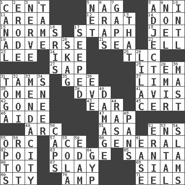 ACROSS 1. Penny 5. Tired old horse 8. Cuckoo 11. Type of rug 12. Part of Q.E.F. 14. Spanish title 15. Typical standards 17. Staphylococcus 18. Type of plane 19. Contrary to your interests or welfare 21. Ocean 22. Pipe bend 23. Area sheltered from the wind 24. D.D.E's nickname 25. Affectionate concern, for short 27. Plant excrement 28. Detail 31. Scottish caps 35. Unit of force equal to gravity 37. Pale green bean 38. Presage 39. Movie disc 41. Deliberation 42. Went 43. Ewer handle 45. Sure thing 46. Assistant 47. Atlas unit 49. Curve 51. White ___ sheet 52. Followers of ems 55. The grampus (Milton) 57. Adept person 60. Commissioned military rank 62. Luau course 63. Porridge 65. Before Barbara or Clara 66. Small child 67. Kill 68. Thailand, formerly 69. Filthy place 70. Electrical Unit 71. Snakelike fish DOWN 1. Lessep's creation 2. Eat (away) 3. Boldness 4. Not wild 5. Fish or hair follower 6. Ancient river in northeast Turkey 7. Yawn 8. Descriptive word 9. Christmas carol 10. International (abbr.) 13. Not this but _ 16. Indian titles of respect 17. Oozed 20. Heroin 26. Pale purple color 29. Independent ruler or chieftain 30. Vertical spar for supporting sails 31. Ancient Roman robe 32. Mine, in Marseilles 33. Ananias' fault 34. Scornful expression 36. Night before a holiday 40. Break 44. To erase 48. Baking dishes 50. Smile enhancers 52. Bert's buddy 53. Relating to or accompanying birth 54. Hits or strikes with great force 55. Elects 56. Carrot, for example 58. Root beer relative 59. Dutch treat 61. Comfort 64. Flimflam