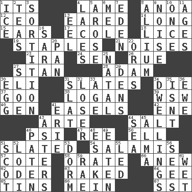 ACROSS 1. ___ a Wonderful Life 4. Unable to walk 8. Small Philippine buffalo 12. Corporate head (abbr.) 13. Having ears or earlike features 14. Yearn 15. Hearing organs 17. Learning spot: Fr. 18. Louse (plural) 19. Paper fasteners 21. Annoying sounds 23. Retirement account (abbr.) 24. Elected rep. 26. Sorrow 27. Comedian Laurel of Laurel & Hardy 28. First of billions? 30. Connecticut Ivy Leaguer 31. Chalkboards 34. Pass on 37. Thick or sticky substance 38. Utah city north of Ogden 39. Compass dir. 40. Commissioned mil. rank 41. Artist's stands 42. Compass dir. 43. Johnson of "Laugh-In" 44. Table seasoning 46. Air pressure measure (abbr.) 47. To separate or throw off 50. Pipe bend 51. Scheduled 54. Deli grouping 57. ____ d'Azur (French Riviera) 58. Declaim 60. Afresh 62. River in Europe 63. Swept the length of 64. Turn to the right 65. Metal containers 66. Count _ (2 wds.) 67. Fast jet (abbr.) DOWN 1. Frozen water 2. Beverages made from leaves 3. Making a chance decision by using lots 4. Shoestrings 5. Came up 6. Cartoonist voice _ Blanc 7. Locale of original sin 8. Plant genus of onion and garlic 9. Annoying sound 10. At one time in the past 11. Ripens 13. Snakelike fish 16. "Two Mules for Sister ____" 20. Baking dish 22. Mouths or openings 25. Brizilian seaport 27. _ gin 29. Lairs 30. Oval reproductive body of a fowl 31. Narrow board 32. Failure 33. Ripen 34. Residences 35. Is not 36. She-sheep 41. One of the Great Lakes 43. Michaelmas daisies 44. Ocean 45. _ mater 46. Eucharist need 48. 1973 Nobel Price Winner (Physics) Leo 49. Ingested 51. Highlander 52. Farming town in central California 53. Dormintory (informal) 55. Directed 56. Observes 59. Actress Charlotte 61. Soggy