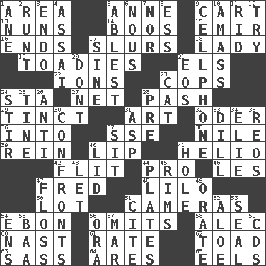 ACROSS 1. Type of rug 5. Singer Murray 9. Haul 13. Religious women 14. Scornful sounds 15. Arab leader 16. Extremities 17. Plays smoothly or legato 18. Kenny Rogers chart-topper in '80 19. Sycophants 21. Raised railways 22. Charged atoms 23. 911 reaches them 24. R.R. building 27. Fish or hair follower 28. Romantic infatuation 29. A color or tint 31. Tate display 32. River in Europe 36. To the inside or interior of 37. Compass dir. 38. The longest river in the world 39. It's straight from the horse's mouth 40. Mouth edge 41. Sun: prefix 42. Sudden quick movement 44. Adept person 46. French article 47. Flintstone 48. _ and Stitch 50. Car dealer's back yard 51. Devices for capturing images 54. Inky black, to poets 56. Leaves out 58. Actor Baldwin 60. Political cartoonist Thomas 61. Pace 62. Frog relative 63. Backtalk 64. Ancient Greek god of war 65. Snakelike fish DOWN 1. A saturated hydrocarbon 2. Undersized animal 3. Inside; within (prefix) 4. Slender Brazilian palm 5. Most capable 6. Common sense 7. And not 8. Curvy letter 9. Portable communications device 10. Collect or gather 11. To free from 12. Attempt 17. Trig term 20. Do not 21. Greek goddess of the dawn 23. Domesticated feline 24. Commotion 25. Prong on a fork 26. Against 28. Before (prefix) 30. Meets 31. Viper 33. Deli pickle 34. Writer Wiesel 35. Vintage cars 37. Be seated 40. Flaplike covering 41. Opening into or through something 43. Allow 44. Food holders 45. Basketball hoops 47. Soft thread for cleaning between teeth 49. Speak pompously 51. Quote 52. Medicinal plant 53. Lick closed 54. Followers of ems 55. Sound made by sheep 56. Mouth or opening 57. Make imperfect 59. Music discs