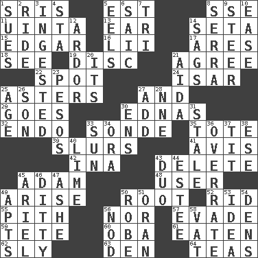 ACROSS 1. Indian titles of respect 5. Eastern Standard Time (abbr.) 8. Compass dir. 11. National forest in Provo, Utah 13. Hearing organ 14. Stalk of a moss capsule 15. _ Allan Poe 16. Cards in a Roman deck? 17. Ancient Greek god of war 18. Observe 19. Compact _ 21. Match 22. Specific locale 24. Austrian river, tributary to the Danube 25. Michaelmas daisies 27. Also 29. Moves 30. Ferber et al. 32. Inside; within (prefix) 33. Message 35. Carry 39. Runs notes together 41. Opinion 42. _ tizzy (2 wds.) 43. Keyboard key 45. First man 48. One who makes use of a thing 49. Originate 50. Carrot, for example 52. To free from 55. Essential or central part 56. Or not 57. Elude 59. Wig 60. Chief or king in Benin or Nigeria 61. Ingested 62. Playfully artful 63. Lair 64. Afternoon social gatherings DOWN 1. Institutes legal proceedings 2. Travel on an animal 3. Swallowed 4. R.R. building 5. Snakelike fish 6. Ketch in the Levant 7. Three (prefix) 8. Father Junipero _ 9. Navigate 10. Comfort 12. Zeal 14. Settles 20. It is 21. Opera by Verdi 23. Mexican monetary units 25. Grow older 26. Boy, to dad 27. Increase 28. Compass dir. 30. Followers of ems 31. Lacking originality or spontaneity 33. Player for Phoenix 34. Mouth or opening 36. Make much ado about nothing 37. Teat (slang) 38. Compass dir. 40. Welles in "The Third Man" 43. Superhero pair 44. First name in cosmetics 45. Satellite of Uranus 46. Simple song 47. American tennis player Robert 49. Tenement units (abbr.) 50. Loose flowing garment 51. Northwest Algerian city 53. The main thing one is thinking about 54. Hiding places for outlaws 56. Dreamland 58. Large container