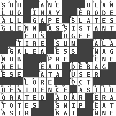 ACROSS 1. Quiet! 4. A saturated hydrocarbon 7. Uhlan (variant) 11. Nilotic language 12. "If ____ say so..." 13. Wear away 14. Everything 15. Open wide 16. Chalkboards 17. American astronaut and politician John 19. Helper 21. Greek goddess of the dawn 23. Double curve, resembling the letter S 24. Hoop that covers a wheel 25. Player for Phoenix 26. According to 29. An organ shaped like a helmet 30. Double-curved letter 31. Tired old horse 32. Disorderly crowd 33. Before (prefix) 34. Compass dir. 35. Cartoonist voice _ Blanc 36. Ewer handle 37. Debunk (Brit. slang) 40. Compass dir. 41. _ moment's notice (2 wds.) 42. One who makes use of a thing 43. Old wives' tales, e.g. 45. Sep. follower 46. Home 51. Being in motion 55. Spoke pompously 56. The sixth month of the Jewish calendar 58. Epoch 59. Lugs 60. Clip 61. Erode 62. SW Saudi Arabia district 63. Krazy ___ of comics 64. Compass dir. DOWN 1. Volcanic refuse 2. Frame or body of a ship 3. Opening into or through something 4. Housemaid (var.) 5. California wine valley 6. Snake ____ (dice throw) 7. A salt of uric acid 8. Globular water bottle used in Asia 9. An important port of Yemen 10. Egg locale 12. Refuse to acknowledge 13. Otherwise 16. Omens 18. Famous astronaut Armstrong 20. Lush 22. Ocean 24. Eating place 25. Spanish missionary in California 26. Approach 27. Austrian-born American filmmaker Fritz 28. Personal question 29. Travels 32. Madame (abbr.) 33. Eucharist need 36. Having ears or earlike features 37. Superhero pair 38. Fortification 39. Stakes 43. 61 cubic inches 44. Lyric poems 46. Roll call or roster of names 47. Greek god of love 48. Suttee (variant) 49. Keg 50. Pulitzer Prize-winning author Ferber 52. Adolescent 53. SW Asia republic 54. Pace 57. Small island
