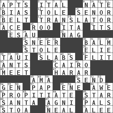 ACROSS 1. Tenement units (abbr.) 5. Slanted text style (abbr.) 9. Nathan's nickname 13. Prejudice 14. Lacquered or enameled metalware 15. Sir (Sp.) 16. Waist strap 17. Interpreter 19. Adept person 20. Friend of Pooh 21. Call ___ day 22. ___ a Wonderful Life 23. Son of Isaac 25. Tired old horse 26. Contemptuous expression 30. Lip ointment 34. Fur scarf 35. Writer Wiesel 36. "Change" in Tahitian 39. Broad, flat, thick pieces 42. Secret move to avoid paying debts 43. Pismires 44. Capital of Egypt 46. Confront 47. Ethiopian city, capital of Harari 48. Housemaid (var.) 51. Post 54. Commissioned mil. rank 57. Infant food 58. Compass dir. 60. Deep reverence 62. Conciliate 65. Play the lead 66. Before Barbara or Clara 67. Hindu god of fire 68. Friends 69. Portico 70. Actress Patricia 71. Toward shelter DOWN 1. Swedish rock group 2. Part 3. Falsehoods 4. Fast jet (abbr.) 5. "Tell ____ the Marines!" 6. "Corrida" creature 7. According to 8. Soviet premier 1918-24 9. Teachers' org. 10. Opposed to 11. A blast of a horn 12. Blunders 15. Volcanic refuse 18. R.R. building 20. Undersized animal 24. Aid 27. Greek goddess of the dawn 28. Pipe bend 29. Arrive at 30. Prior to 31. Everything 32. Cards in a Roman deck? 33. Was introduced to 36. Scottish cap 37. A saturated hydrocarbon 38. Shoshoni 40. Sound made by sheep 41. Title for a knight 45. To erase 48. Capital of Western Samoa 49. Floor covering 50. Bee-related 52. Brizilian seaport 53. A sleeping potion; an opiate (poet.) 54. Global Positioning Systems (abbr.) 55. Part of Q.E.F. 56. Words to Nanette 58. Inactive volcano in Sicily 59. Famous astronaut Armstrong 61. Celtic language 63. Parent Teacher Association (abbr.) 64. Personal question 65. Health resort