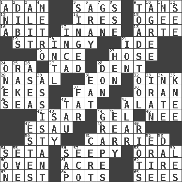 ACROSS 1. First of billions? 5. Droops 9. Scottish caps 13. "Death on the ____" 14. Angers 15. Double curve, resembling the letter S 16. "This won't hurt ____!" 17. Lacking in sense or substance 18. Johnson of "Laugh-In" 19. Slender, wiry 21. Binary compound 22. Single time 23. Stockings 24. Mouth or opening 27. Small amount or degree 28. Incision 29. Relating to the nose 31. A really long time 32. Pig sound 36. Supplements with great effort 37. Avid follower 38. Northwest Algerian city 39. Oceans 40. Make lace 41. Having winglike extensions 42. Austrian river, tributary to the Danube 44. Set 46. Born 47. Son of Isaac 48. Bring up, as a child 50. Filthy place 51. Borne 54. Bristle 56. Not well drained, as in land 58. Taken by mouth 60. Baking chamber 61. 43,560 square feet 62. Hoop that covers a wheel 63. A home for chicks 64. Cooking vessels 65. Perceives with the eye DOWN 1. Santa ___, CA 2. Claim 3. Set down 4. Paris' subway 5. Burned superficially 6. Like ___ of sunshine 7. Commissioned mil. rank 8. Compass dir. 9. Inedible or poisonous agaric 10. Match 11. Was introduced to 12. Observe 17. South American Indian 20. International (abbr.) 21. Electrically charged atom 23. Layer 24. Singles 25. Libertine 26. At sea 28. Spanish title 30. Helper 31. Consume 33. SW Asia republic 34. Nathan's nickname 35. Leg joint 37. At a great distance 40. The 19th letter of the Greek alphabet 41. Having or resembling wings 43. Declare 44. Raisin fruits 45. Suggestive of the supernatural 47. _____ Park, CO 49. Debaucheries 51. An absolute certainty 52. One of the Great Lakes 53. Have the gumption 54. Boy, to dad 55. Night before a holiday 56. Plant excrement 57. Environmental prefix 59. French article