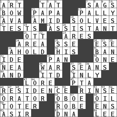 ACROSS 1. Nonscientific branch of learning 4. Make lace 7. Droops 11. Arrow shooter 12. Dad 13. Chummy 14. Actress Gardner 15. Among 16. Finds the solution 17. Trials 19. Helper 21. Baseball player Mel 23. Ancient Greek god of war 24. Type of rug 25. Compass dir. 26. Compass dir. 29. Hold, grip (Informal) 30. Part of HMS, perhaps 31. Prohibit 32. Binary compound 33. Baking dish 34. Single 35. Teachers' org. 36. Armed conflict 37. Seines 40. Plus 41. It would 42. In an inward manner 43. Old wives' tales, e.g. 45. Parent Teacher Association (abbr.) 46. Home 51. Remove soap 55. Speaker 56. Mitch Miller's instrument 58. Lubricate 59. Carrier 60. Loose flowing garment 61. Followers of ems 62. SW Saudi Arabia district 63. Heredity factor (abbr.) 64. Area sheltered from the wind DOWN 1. Blind as ____ 2. Be footloose 3. It was, poetically 4. Scottish cap 5. Capital of Western Samoa 6. Small boys 7. Table seasonings 8. Inventor's middle name 9. Small, secluded valley 10. System (abbr.) 12. Soft color 13. Introduce or present, as a question 16. Titles for men of rank and authority 18. "Corrida" creature 20. Indian antelope 22. Small boy 24. Having the leading position 25. Pottery fragment 26. Dark wood 27. Without 28. Compass dir. 29. Arabian gulf 32. _ tizzy (2 wds.) 33. Eucharist need 36. One who wires 37. Small drink 38. Main course 39. Jai ____ 43. 61 cubic inches 44. Aroma 46. Round or rotation of duties 47. Greek god of love 48. Suttee (variant) 49. Drawstring 50. Inky black, to poets 52. Christmas carol 53. Trig term 54. Otherwise 57. Chief or king in Benin or Nigeria