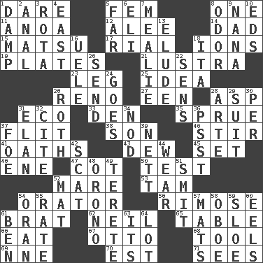 ACROSS 1. Have the gumption 5. Opposite of masc. 8. Single 11. Small Philippine buffalo 12. Toward shelter 14. June honoree 15. Taiwanese island in East China Sea 17. Monetary unit of Yemen 18. Charged atoms 19. Food holders 21. A period of five years 23. Part of a journey 25. The main thing one is thinking about 26. Former U.S. Attorney General Janet 27. Car or cant ending 28. Viper 31. Environmental prefix 33. Lair 35. Disorder 37. Secret move to avoid paying debts 38. Male offspring 40. Commotion 41. Profane or obscene expressions 43. Morning condensation 45. Put into a specified state 46. Compass dir. 47. Small bed 50. Trial 52. Female horse 53. Scottish cap 54. Speaker 56. Full of chinks, cracks, or crevices 61. Naughty child 62. Famous astronaut Armstrong 65. Eating place 66. Consume 67. Von Bismarck 68. Instrument 69. Compass dir. 70. Eastern Standard Time (abbr.) 71. Perceives with the eye DOWN 1. Moist 2. Of or related to the anus 3. Round or rotation of duties 4. 90 degrees 5. Distant 6. Connecticut Ivy Leaguer 7. Ear of corn 8. Scent 9. Grandmother 10. Begley and Asner 13. Evade 16. Ubangi River tributary 18. Call ___ day 20. Post 22. Elected reps. 24. Travels 26. Writer of Portnoy's Complaint (1969) 28. Johnson of "Laugh-In" 29. Costume for a special activity 30. For each 31. Liveliness 32. Quote 34. Dreamland 36. Inconspicuous attention getter 37. Enemy 39. Remaining after all deductions 42. Scram! 44. Put on (as clothing) 48. U. of Maine site 49. Cigar-shaped 51. Stricken, poetically 52. Floor protector 54. Northwest Algerian city 55. Assign a rank or rating to 57. Floor coverings 58. Mitch Miller's instrument 59. _ gin 60. Snakelike fish 61. Benjamin's nick name 63. It is 64. Car dealer's back yard