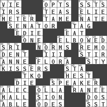 ACROSS 1. Compete 4. Chooses 8. Fast planes 12. Big collection agency 13. Beverages made from leaves 14. Writer Wiesel 15. Distance measurement 18. Not wild 19. Nathan's nickname 20. Legislator 22. Label 23. Singer Brickell 24. Erode 25. Single 26. Shoved, as through a crowd 30. _ Lanka 33. Typical models 36. San ____ (Riviera town) 37. Scratch 39. One more than two 40. Move through with a circular motion 41. Queen of England 1702-14 42. Plants 44. Filthy place 45. Smoochers 47. R.R. building 50. Ring climax 51. Command 53. Expire 54. Orator 57. Actor Baldwin 59. Water jar 61. Indian princess (variant) 63. Shopping center 64. The Jewish people; Israel 65. Two (Sp.) 66. Competent 67. Lyric poems 68. Fast jet (abbr.) DOWN 1. Zeal 2. Angers 3. First name in cosmetics 4. Von Bismarck 5. Lightbulb-shaped fruit 6. Scottish cap 7. Compass dir. 8. Elected representatives 9. Volcanic refuse 10. Teat (slang) 11. Perceive with the eye 16. Inside; within (prefix) 17. Water falling in drops from the sky 21. Adolescent 22. Bar bill 24. Raised railways 26. Independent ruler or chieftain 27. Soaks 28. Give off 29. Small, narrow, flatbottom fishing boat 30. Neighbor of Neb. 31. Painter Guido (1575-1642) 32. Restaurants 34. Petroleums 35. _ de Janeiro 38. A testis 42. Back 43. American tennis player Robert 46. Make supply last 48. Rend 49. "____ silly question..." 52. Watches over 53. Small valley 54. A type of plum 55. Zero-star reviews 56. Vintage cars 57. Wet nurse (var.) 58. Experiment locale 59. Bear (Spanish) 60. Flaplike covering 62. Eastern Standard Time (abbr.)