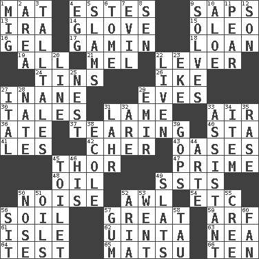 ACROSS 1. Floor protector 4. _____ Park, CO 9. Plant excrements 13. Lyricist Gershwin 14. Michael Jackson trademark 15. Butter sub 16. Set 17. Street urchin 18. Grant temporary use of 19. Everything 21. Cartoonist voice _ Blanc 22. Crowbar 24. Metal containers 26. Eisenhower's nickname 27. Lacking in sense or substance 29. Nights before holidays 30. Falsehoods 31. Unable to walk 33. Wind 36. Had dinner 37. Rending 40. R.R. building 41. French article 42. "Mermaids" star 43. Fertile tracts in a desert 45. Son of Odin 47. First class 48. Petroleum 49. Fast planes 50. Annoying sound 52. Leather borer 54. And so on (abbr.) 56. The visible part of the earth's surface 57. Relatively large 59. Sandy's bark 61. Capri or Wight 62. National forest in Provo, Utah 63. Teachers' org. 64. Trial 65. Taiwanese island in East China Sea 66. "___ Little Indians" DOWN 1. Russian fighter aircraft 2. Length times width 3. Baron Munchausen's specialties 4. Ovum 5. Criticizes harshly 6. Heavy book 7. Tending to cause great harm 8. Elected rep. 9. Finds the solution 10. _ vera 11. Lightbulb-shaped fruit 12. Boy, to dad 20. Actor's bit 22. Make or become more lively 23. Supplement with great effort 25. Egg locale 27. Slanted text style (abbr.) 28. Nathan's nickname 29. Independent ruler or chieftain 31. Cowardly lion portrayer 32. "We ___ not amused" (Victoria) 33. Helper 34. Detail 35. To erase 38. Learning spot: Fr. 39. Republicans 44. Johnson of "Laugh-In" 45. Bathroom 46. Part of HMS, perhaps 49. Narrow boards 50. Olfactory organ 51. Petroleums 52. Roberta Peters solo 53. Gone 55. Algonquian 56. Be seated 57. Chewing product 58. The 19th letter of the Greek alphabet 60. Avid follower