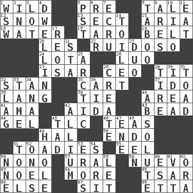 ACROSS 1. Uncontrolled 5. Before (prefix) 8. Lie 12. Overwhelm 13. Religious group 15. Operatic vocal solo 16. Wetness 18. Edible starchy tuberous root 19. Waist strap 20. French article 22. Noisy, rowdy, vocal (Spanish) 24. Globular water bottle used in Asia 26. Nilotic language 27. Austrian river, tributary to the Danube 28. Corporate head (abbr.) 29. Teat (slang) 32. Comedian Laurel of Laurel & Hardy 35. Heavy open wagon 37. Wedding promise 38. Austrian-born American filmmaker Fritz 39. Neckwear 40. Length times width 41. Housemaid (var.) 42. Opera by Verdi 43. Necklace unit 44. Set 45. Affectionate concern, for short 46. Beverages made from leaves 49. Actor Linden 50. Inside; within (prefix) 51. Sycophants 55. Snakelike fish 56. Words to Nanette 57. Mountain range 59. New (sp.) 63. Christmas carol 64. Greater amount 65. Russian ruler of old 66. Otherwise 67. Be seated 68. Singer James DOWN 1. Compass dir. 2. _ tizzy (2 wds.) 3. Car dealer's back yard 4. Home 5. Pacific Standard Time (abbr.) 6. Buttocks 7. Shade of tan 8. Off limits 9. Ancient Greek god of war 10. _ and Stitch 11. Consume 14. Bathroom 17. Vintage cars 21. R.R. building 23. Superhero pair 25. Northern region 28. Make 29. Hoop that covers a wheel 30. The content of cognition 31. Frog relative 32. Volcanic refuse 33. Not wild 34. Of or related to the anus 36. Help 40. Utter; complete 42. Plant genus of onion and garlic 45. Bit 47. Compass dir. 48. An important port of Yemen 49. White Person, in Hawaii 51. Instrument 52. Singles 53. Greek god of love 54. Indian skirt 56. Compass dir. 58. Allow 60. Eastern Standard Time (abbr.) 61. Large container 62. Mouth or opening