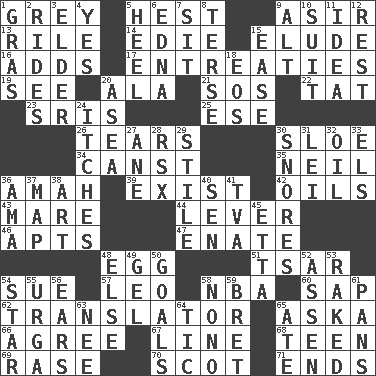 ACROSS 1. Jennifer or Joel 5. Behest 9. SW Saudi Arabia district 13. Cause heat under the collar 14. Singer Brickell 15. Evade 16. Sums up 17. Pleas 19. Observe 20. Chicken ___ king 21. Distress signal 22. Make lace 23. Indian titles of respect 25. Compass dir. 26. Rends 30. _ gin 34. 2nd pers. sing. pres. of can (arch.) 35. Famous astronaut Armstrong 36. Wet nurse 39. Be 42. Lubricates 43. Female horse 44. Prying instrument 46. Flats, for short 47. Maternal 48. Ovum 51. Russian ruler of old 54. Institute legal proceedings 57. Lion 58. Basketball assoc. 60. Plant excrement 62. Interpreter 65. "____ silly question..." 66. Match 67. Actor's bit 68. Adolescent 69. To erase 70. Highlander 71. Conclusions DOWN 1. Pate de foie ____ 2. Amusement-park features 3. A person who is older than you are 4. Affirmative reply 5. Person who is morally reprehensible 6. Pulitzer Prize-winning author Ferber 7. Be seated 8. Laconic 9. Keyboard modifier key 10. Set of matching outer garments 11. The main thing one is thinking about 12. Respite 15. Relaxation 18. Greek goddess of the dawn 20. Toward the sea 24. Skin irritations 27. One (Scot) 28. Acura sports coupe 29. Vertical member of a panel or frame 30. Sounds asleep 31. Flowery wreath 32. Lubricate 33. Raised railways 36. Wet nurse (var.) 37. Atlas unit 38. Tate display 40. Elected rep. 41. Federal power corp. 45. Singer James 48. Otherwise 49. Set 50. Finish lines 52. NE Netherlands city 53. Moved through 54. Play the lead 55. Capital and largest city of Mongolia 56. Hearing organs 58. Words to Nanette 59. Cy Young winner Saberhagen 61. Zero-star reviews 63. Born 64. Nervous spasm 65. Had dinner