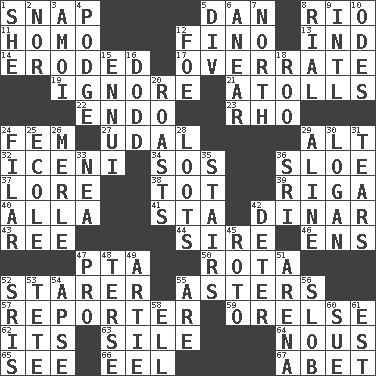 ACROSS 1. Fastener 5. One of the 12 tribes of Israel 8. _ de Janeiro 11. Like (prefix) 12. Fine (Spanish) 13. Working for oneself (abbr.) 14. Eaten away 17. Make much ado about nothing 19. Disregard 21. Ringlike coral islands and reefs 22. Inside; within (prefix) 23. 17th letter of the Greek alphabet 24. Opposite of masc. 27. Allodial 29. The first octave above the treble staff 32. Ancient Celtic tribe of eastern Britain 34. Mayday 36. A type of plum 37. Old wives' tales, e.g. 38. Small child 39. Capital of Latvia 40. Silent film actress Nazimova 41. R.R. building 42. Middle Eastern gold or silver currency 43. To separate or throw off 44. Beget 46. Followers of ems 47. Parent Teacher Assoc. 50. Roll call or roster of names 52. A viewer who gazes fixedly 55. Michaelmas daisies 57. Newsperson 59. Threatening words 62. It is 63. Drop; flow; fall 64. Good sense 65. Observe 66. Snakelike fish 67. Collude with DOWN 1. A female animal or person 2. And not 3. Mine, in Marseilles 4. Plash 5. HTML Container Element 6. Approach 7. _ pole 8. Monetary unit of Yemen 9. International (abbr.) 10. Lyric poems 12. Enemy 15. World-weariness 16. Texas town _ City 18. Friend of Pooh 20. Exposes to great heat 24. Of or pertaining to a thread or threads 25. Learning spot: Fr. 26. Haggard of country music 28. Plunders 29. Place in a line 30. Utah city north of Ogden 31. Rends 33. Teachers' org. 35. Flight of steps 36. Indian title of respect (Mr.) 42. Prevent from occurring 45. Printing process, for short 47. Adept person 48. Laconic 49. Nick name for Arthur 51. Sports stadium 52. Indian titles of respect 53. False hair 54. Domed church section 55. "We ___ not amused" (Victoria) 56. Messy guy 58. Pipe bend 60. Take to court 61. Eastern Standard Time (abbr.)