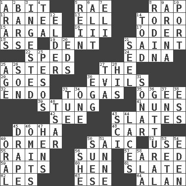ACROSS 1. "This won't hurt ____!" 5. Actress Charlotte 8. Reproach for some lapse or misdeed 11. The wife of a rajah (variant) 13. Pipe bend 14. "Corrida" creature 15. Therefore, facetiously 16. One more than two 17. River in Europe 18. Compass dir. 19. Gouge 21. Virtuous person 22. Drove too fast 24. Pulitzer Prize-winning author Ferber 25. Michaelmas daisies 27. Definite Article 29. Moves 30. Vices 32. Inside; within (prefix) 33. Ancient Roman robes 35. Double curve, resembling the letter S 39. Feeling sharp psychological pain 41. Religious women 42. Perceive with the eye 43. Chalkboards 45. Capital of the state of Qatar 48. Heavy open wagon 49. Channel Islands abalone 50. Ketch in the Levant 52. Purpose 55. Water falling in drops from the sky 56. Player for Phoenix 57. Having ears or earlike features 59. Flats, for short 60. Layer 61. Schedule 62. French article 63. Compass dir. 64. ____ Jay Lerner DOWN 1. Caspian sea tributary 2. Drinking establishments 3. Eaten 4. Afternoon social gathering 5. It's straight from the horse's mouth 6. Came down and settled, as after flight 7. Biblical high priest 8. "The Thinker" sculptor 9. Sports stadium 10. Left side of a ship or aircraft 12. A person who is older than you are 14. Frog relative 20. Begley and Asner 21. Sew up the eyelids of hawks and falcons 23. Mexican monetary units 25. Grow older 26. Male child 27. Federal power corp. 28. Part of HMS, perhaps 30. Ovum 31. Underwater navigation system 33. Third day of the wk. 34. Single 36. From the throat 37. Compass dir. 38. Curvy letter 40. Russian ruler of old 43. _-fi 44. Shoestrings 45. Window treatment 46. Leaves out 47. Coop moms 49. Taken by mouth 50. Takes to court 51. Singer Murray 53. Bristle 54. Locale of original sin 56. A female animal or person 58. Chicken ___ king
