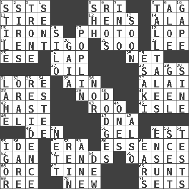 ACROSS 1. Fast planes 5. _ Lanka 8. Label 11. Hoop that covers a wheel 12. Coop moms 14. In the manner of 15. Metal shackles 17. Picture 18. Trim (branches) 19. Small, flat, pigmented spot on the skin 21. "Barney Miller" actor Jack 22. Area sheltered from the wind 23. Compass dir. 24. Infant locale 25. Fish or hair follower 27. Lubricate 28. Droops 31. Old wives' tales, e.g. 35. The 18th letter of the Arabic alphabet 37. Mountain range southwest of Kyrgyzstan 38. Ancient Greek god of war 39. Dreamland 41. Peachy ____! 42. Vertical spar for supporting sails 43. Friend of Pooh 45. Small island 46. Writer Wiesel 47. Heredity factor (abbr.) 49. Lair 51. Set 52. Eastern Standard Time (abbr.) 55. Binary compound 57. Epoch 60. Substance 62. Separate the seeds from cotton 63. Is inclined (to) 65. Fertile tracts in a desert 66. The grampus (Milton) 67. Prong on a fork 68. Undersized animal 69. Portuguese money of account (variant) 70. ___ Haven, CT 71. Puts into a specified state DOWN 1. Vertical member of a panel or frame 2. Begets 3. Heavy duty weighing machine 4. Emitted 5. Quiet! 6. Vintage cars 7. To the inside or interior of 8. Baron Munchausen's specialties 9. Medicinal plant 10. Yawn 13. Within a short period 16. Grain storage tower 17. Cotton for raincoats, e.g. 20. Greek goddess of the earth (variant) 26. 1973 Nobel Price Winner (Physics) Leo 29. Highlander 30. Trig term 31. Unable to walk 32. Taken by mouth 33. Dwelling 34. First name in cosmetics 36. Or not 40. Evades 44. Washington bills 48. In addition 50. Remaining after all deductions 52. Take place subsequently 53. Aroma 54. Trials 55. Russian composer Stravinsky 56. Have the gumption 58. It's straight from the horse's mouth 59. Queen of England 1702-14 61. Hearing organs 64. Morning condensation