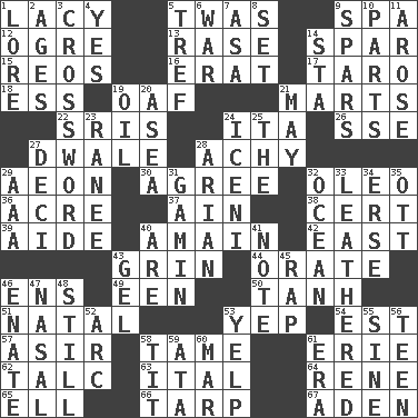 ACROSS 1. Made of lace 5. It was, poetically 9. Health resort 12. Legendary monster 13. Raze (variant) 14. Practice fight 15. Vintage cars 16. Part of Q.E.F. 17. Edible starchy tuberous root 18. Double-curved letter 19. Clumsy lout 21. Shops 22. Indian titles of respect 24. Call ___ day 26. Compass dir. 27. A sleeping potion; an opiate (poet.) 28. Painful 29. Period of immesurable duration 30. Match 32. Margarine 36. Land measure 37. The 18th letter of the Arabic alphabet 38. Sure thing 39. Assistant 40. At full speed 42. Compass direction 43. Broad smile 44. Declaim 46. Followers of ems 49. Car or cant ending 50. Hyperbolic tangent 51. Relating to or accompanying birth 53. Slangy assent 54. Eastern Standard Time (abbr.) 57. SW Saudi Arabia district 58. Not wild 61. One of the Great Lakes 62. Baby powder 63. Slanted text style (abbr.) 64. French philosopher Descartes 65. Pipe bend 66. Canvas cover 67. An important port of Yemen DOWN 1. Old wives' tales, e.g. 2. Eons 3. What you're doing now 4. Affirmative reply 5. Unclean, religiously 6. Armed conflict 7. White ___ sheet 8. Put into a specified state 9. Practice fights 10. Pieces 11. Came up 14. R.R. building 19. Lubricate 20. At sea 21. Fifth month 23. Indian princess (variant) 24. Ancient Celtic tribe of eastern Britain 25. Definite Article 27. Tenth: prefix 28. Believer in; advocate of (suffix) 29. Auto club (abbr.) 31. Homeless child 32. Sea 33. Tough but pliablecoriaceous 34. Celtic language 35. Baseball player Mel 40. "We ___ not amused" (Victoria) 41. Short letter 43. Set 45. Reproach for some lapse or misdeed 46. Related on the mother's side 47. Relating to the nose 48. Free from disturbance or agitation 52. Curve 53. Sharp bark 55. Trig term 56. Adolescent 58. Teat (slang) 59. _ moment's notice (2 wds.) 60. Spoil 61. Epoch