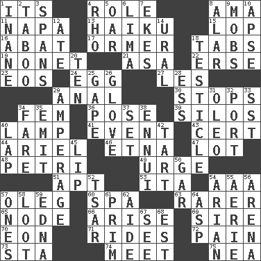 ACROSS 1. It is 4. Hero or heavy, e.g. 8. Housemaid (var.) 11. California wine valley 13. Japanese poetic form 15. Chop off 16. Blind as ____ 17. Channel Islands abalone 18. Bar bills 19. Music written for nine 21. White ___ sheet 22. Celtic language 23. Greek goddess of the dawn 24. Oval reproductive body of a fowl 27. French article 29. Of or related to the anus 30. Constricts 34. Opposite of masc. 36. Airs 39. Grain storage towers 40. Desk light 41. Happening 43. An absolute certainty 44. Satellite of Uranus 46. Inactive volcano in Sicily 47. Car dealer's back yard 48. _ dish (used to culture cells) 49. Goad 51. Fitting 53. Call ___ day 54. American Automobile Association (abbr.) 57. Cassini of fashion 60. Health resort 63. More valued for its uncommonness 65. Connecting point 66. Originate 69. Beget 70. Period of immesurable duration 71. Amusement-park features 72. Ache 73. R.R. building 74. Rendezvous 75. Teachers' org. DOWN 1. Lacking in sense or substance 2. Off limits 3. Connects, as a bridge 4. 17th letter of the Greek alphabet 5. Rowing implement 6. Pale green bean 7. Makes supply last 8. Having or resembling wings 9. Crowds into 10. Domed church section 12. Had dinner 14. Mountain range 18. A testis 20. "___ Little Indians" 25. Stare wonderingly 26. Michael Jackson trademark 28. Double-curved letter 29. Electrical Measurement 31. Margarine 32. Left side of a ship or aircraft 33. Fast jet (abbr.) 34. Conductor's collection 35. Give off 37. Put into a specified state 38. World-weariness 40. Infant locale 42. Small pie 45. Mouth edge 50. Slender fish 52. Russian ruler of old 54. Believer in; advocate of (suffix) 55. Nest on high 56. Sports stadium 57. Washington bills 58. Plunder 59. Pulitzer Prize-winning author Ferber 61. Demure 62. Assistant 64. Cleo's killer 67. Observe 68. Eastern Standard Time (abbr.)