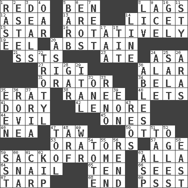 ACROSS 1. Do over again 5. Benjamin's nick name 8. Fails to keep up a pace 12. At sea 13. "We ___ not amused" (Victoria) 14. It is permitted: Lat. 15. Play the lead 16. Happening in regular succession 19. Snakelike fish 20. Refrain by choice 21. Fast planes 23. Had dinner 24. White ___ sheet 27. Swiss mountan, "Queen of the Mountains" 30. Having or resembling wings 31. Speaker 34. Actor Lugosi 35. Part of Q.E.F. 38. Indian princess (variant) 40. Allows 41. Small, narrow, flatbottom fishing boat 42. Poe poem 44. Tending to cause great harm 45. Singles 46. Teachers' org. 47. The 23rd letter of the Hebrew alphabet 50. Von Bismarck 53. Speakers 57. Ripen 59. Italian handbag shop? 63. Silent film actress Nazimova 64. Slow-paced one 65. Nine, plus one 66. Perceives with the eye 67. Canvas cover 68. Conclude 69. Inconspicuous attention getter DOWN 1. To erase 2. _____ Park, CO 3. Allots cards 4. Rowing implement 5. Sharp remark 6. Greek god of love 7. Remaining after all deductions 8. 54 in ancient Rome 9. Adept person 10. Set 11. Filthy place 14. Actor's bit 17. Auto club (abbr.) 18. Teat (slang) 20. SW Saudi Arabia district 22. Trinitrotoluene 24. Toward shelter 25. Table seasoning 26. Ancient river in northeast Turkey 28. Slender fish 29. Slanted text style (abbr.) 30. Most capable 32. Single 33. Western Nevada city 35. Locale of original sin 36. Be footloose 37. Roberta Peters solo 39. Age 43. Vintage cars 47. Utensil 48. Sandy's bark 49. Armed conflict 51. Stories 52. Stares at amorously 54. Lug 55. Presage 56. Tear apart 58. 90 degrees 59. Fast jet (abbr.) 60. Santa ___, CA 61. Automobile 62. Sleep 63. Cleo's killer