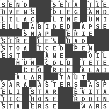 ACROSS 1. Transmit 5. Bristle 9. Neckwear 12. Baking chambers 14. Cassini of fashion 15. Plus 16. Pale purple color 17. Actor's bit 18. Corn or form start 19. Pipe bend 20. Remained 23. Domed church section 24. Fastener 25. One of the Great Lakes 27. Father 30. French article 32. Male parent 33. Portico 34. On the rocks 36. Fenced enclosure 38. Eastern Standard Time (abbr.) 39. A saturated hydrocarbon 40. Lubricate 43. Attila the _ 46. Lacking warmth 48. False hair 49. Corporate head (abbr.) 51. Portuguese money of account (variant) 52. Mountain range southwest of Kyrgyzstan 53. Having or resembling wings 54. Tense 56. "Two Mules for Sister ____" 58. Michaelmas daisies 61. Cleo's killer 64. Biblical high priest 65. Play the lead 66. Webber/Rice musical 68. Nervous spasm 69. Flexible conduit 70. "The Thinker" sculptor 71. R.R. building 72. Celtic language 73. Armed conflicts DOWN 1. Not divided or shared with others 2. Tending to cause great harm 3. 1994 drama film starring Jodie Foster 4. Heredity factor (abbr.) 5. Disposed of to a purchaser 6. Writer Wiesel 7. Watched over 8. Mature 9. Grayish beige 10. Taverns 11. Singer Brickell 13. Examine hastily 21. Indonesian resort city 22. Medicinal drug used to evoke vomiting 23. Helper 24. Ocean 26. Reproach for some lapse or misdeed 27. Compass dir. 28. It is 29. Writer of Portnoy's Complaint (1969) 31. Sir (Sp.) 35. Keyboard key 37. Christmas carol 41. Call ___ day 42. Flowery wreath 44. Southern CA. univ. 45. Teachers' org. 47. Letter starter 48. Make lace 50. Speaker 53. N. Chile seaport 55. One who uses or employs something 56. Arranges properly for use 57. Came down and settled, as after flight 59. Backtalk 60. Relationship diagram 61. Opera by Verdi 62. Commotion 63. Baking dishes 65. A female animal or person 67. Solemn pledge